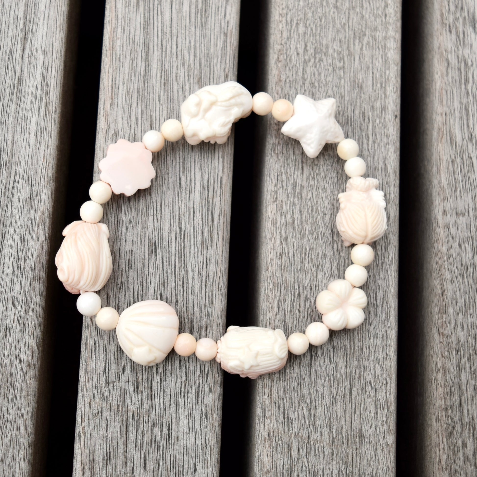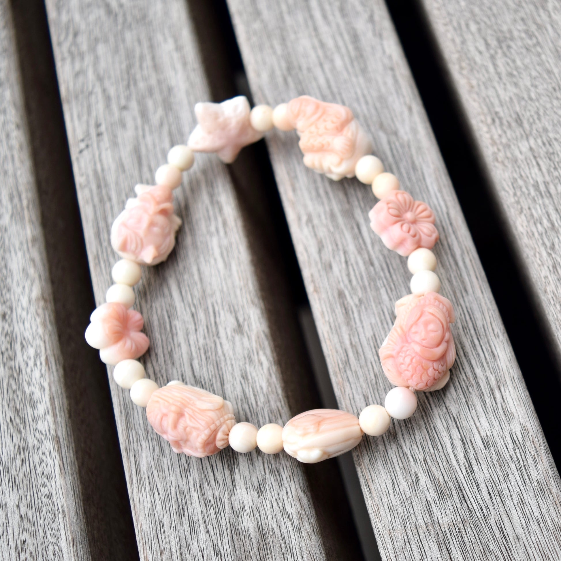 Delicate and dreamy bracelet with a girly heart and a sweet style. Its featured charms are carved mermaid and other ocean-themed items, made of natural queen conch. Most conch findings have soft colors: pink-tone on the front and white on the back. The paired freshwater pearl beads in bracelet also create a lovely and feminine atmosphere.