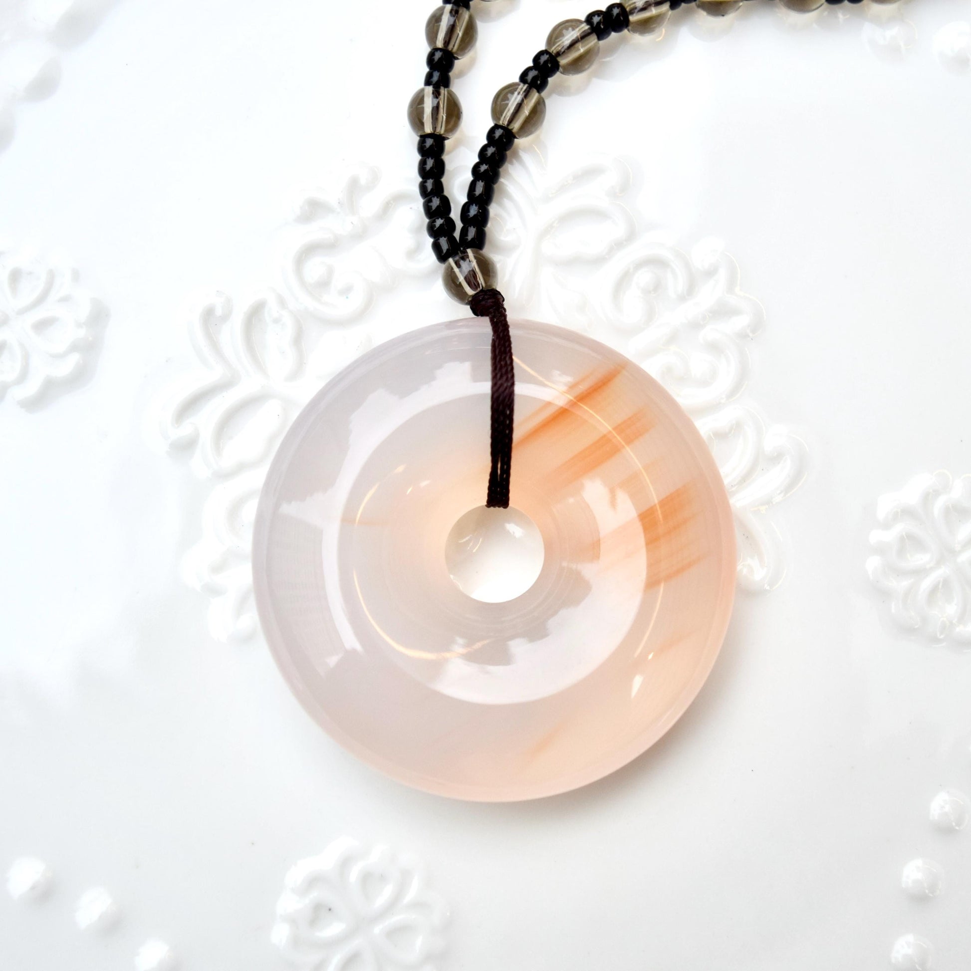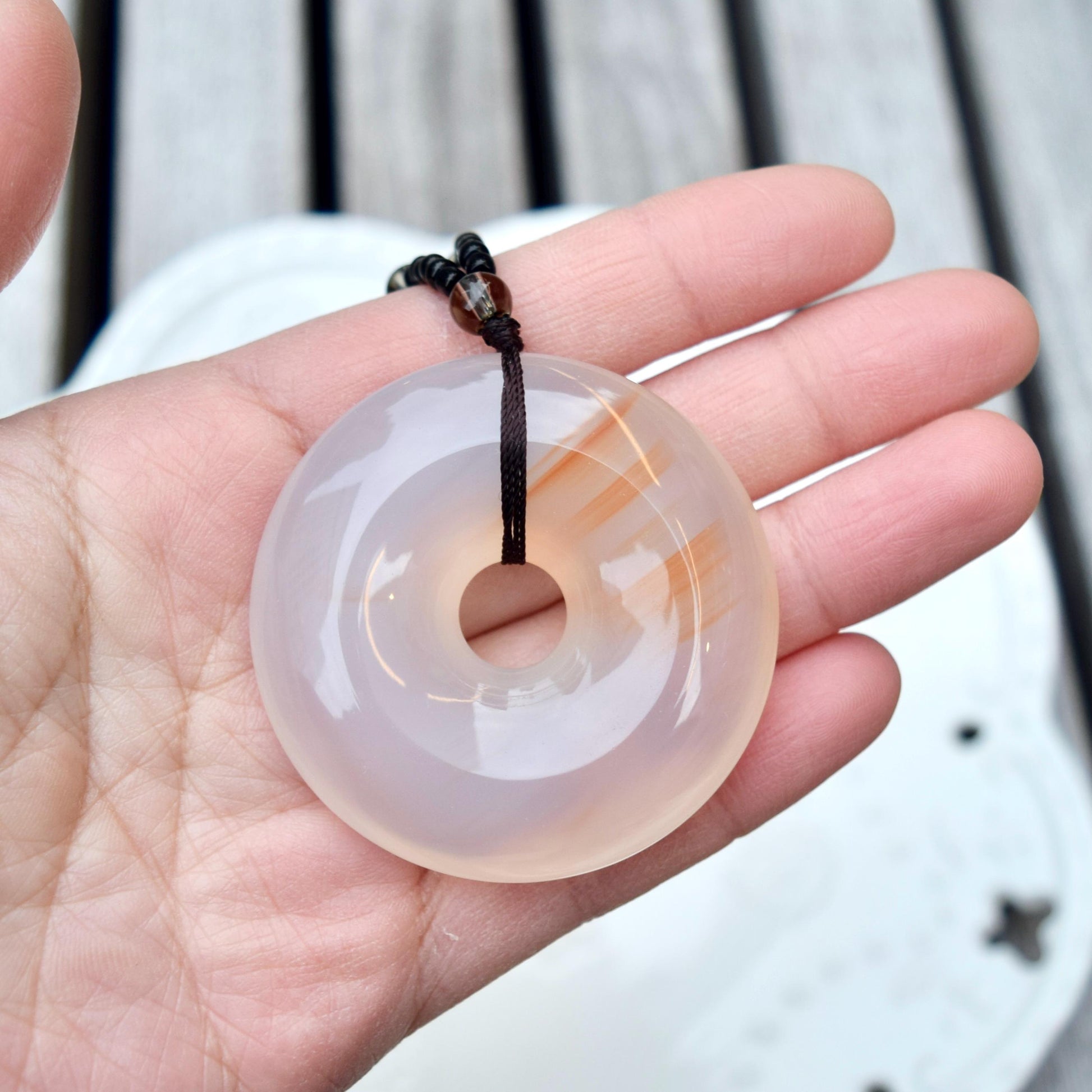 This piece of necklace features agate pendant with peace buckle or donut shape, expressing good wishes for wearers. The paired chain is made of rope and it is durable to wear everyday.