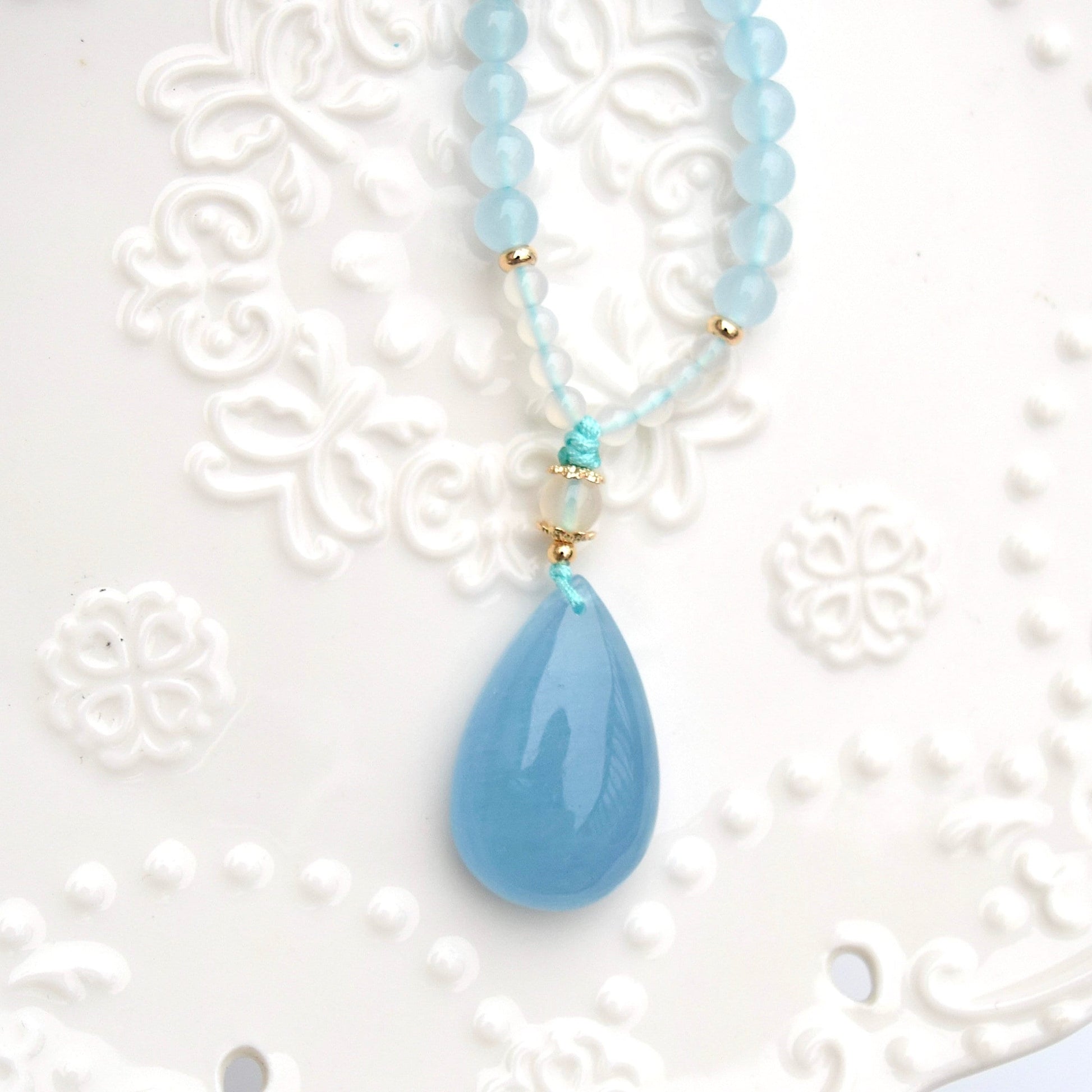 Aquamarine Teardrop Pendant Necklace - Chinese Braided Agate Beads Necklace