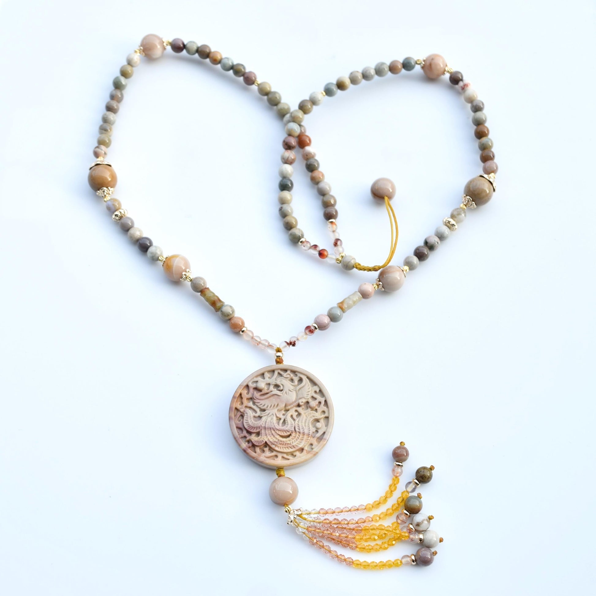 Beige Jasper Phoenix Pendant Tassel Necklace - Colorful Agate Necklace
