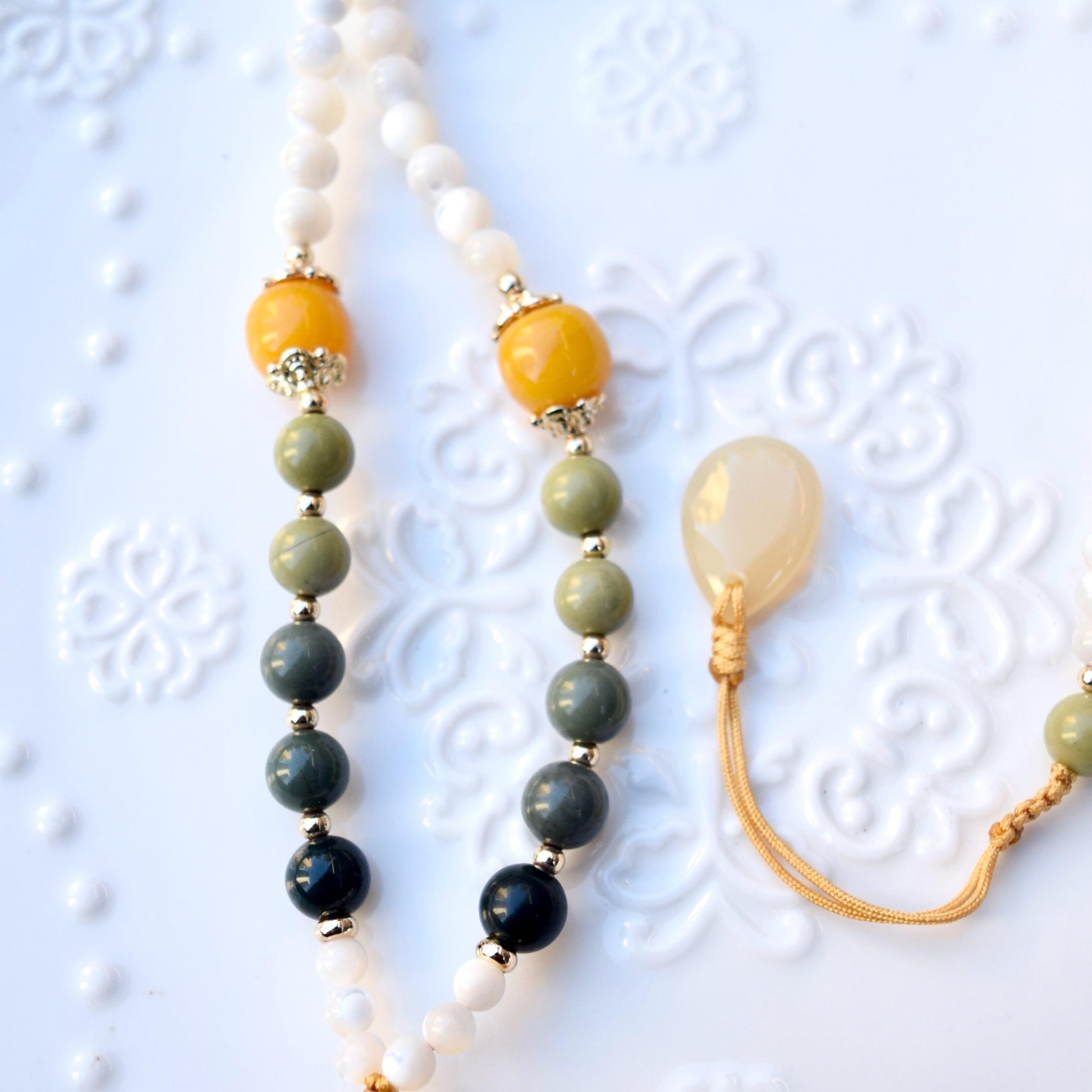 This yellow aventurine pendant is carved with a traditional Chinese pattern: magpies perched on a plum tree branch (喜上眉梢). It symbolizes good fortune and is a perfect gift. The paired beads are natural colorful agate and white shell beads. The yellow tone creates a sweet and fresh style and is perfect for someone with a girly heart!