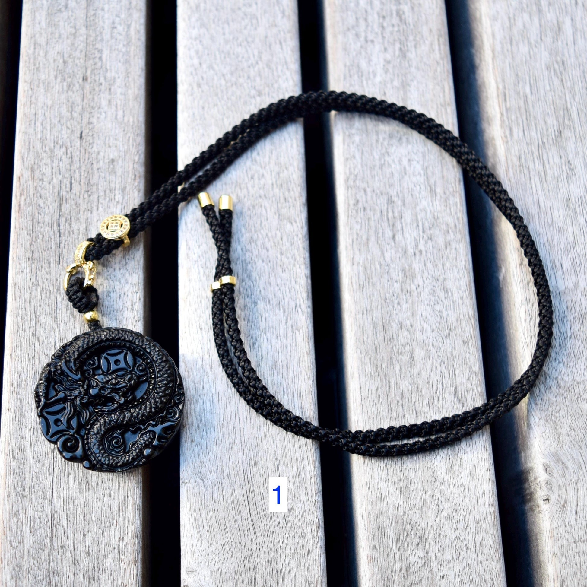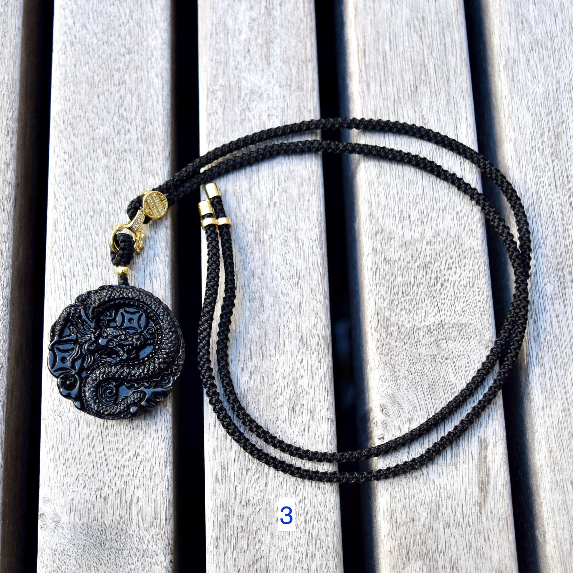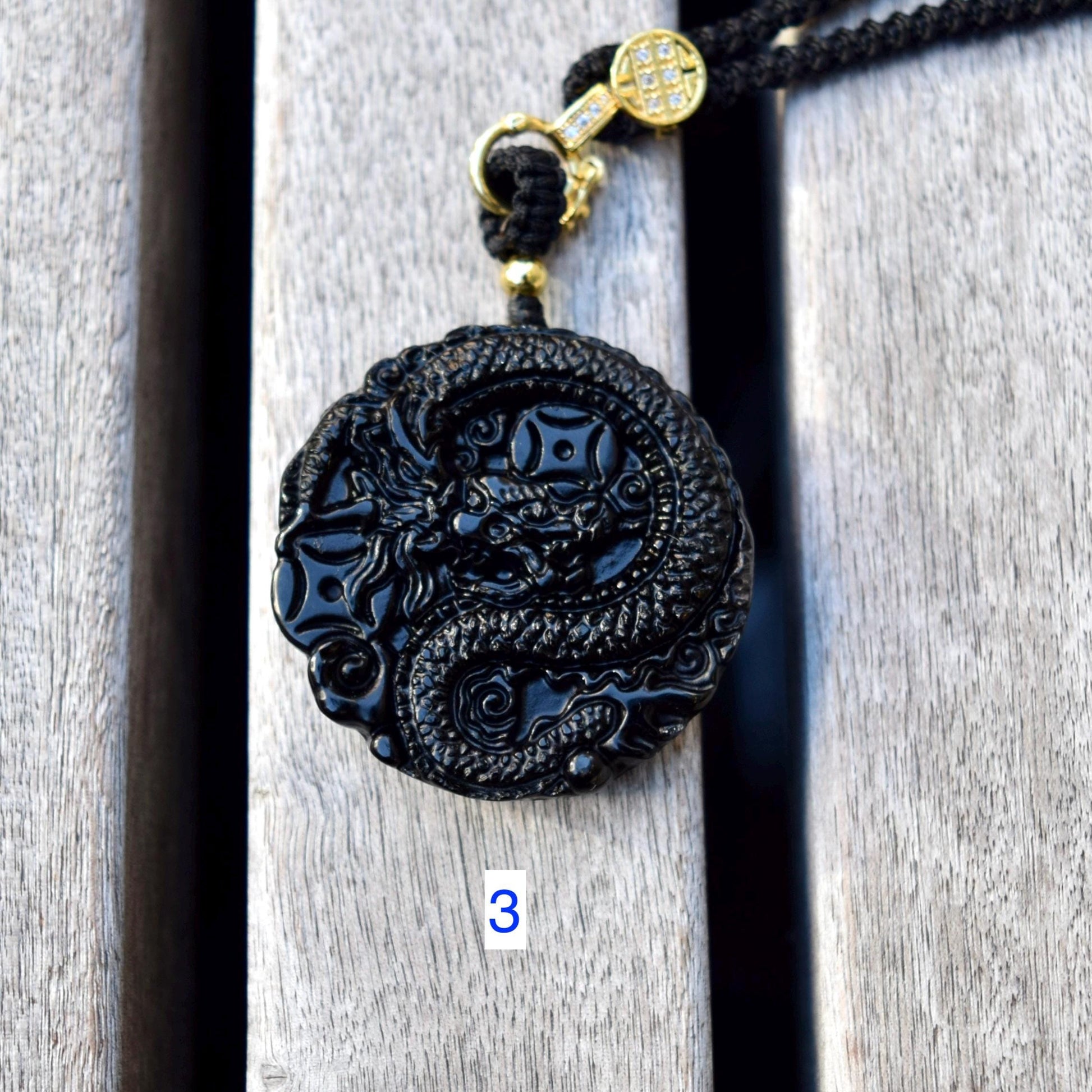This featured pendant is carved as Chinese dragon. It is made of natural black obsidian.