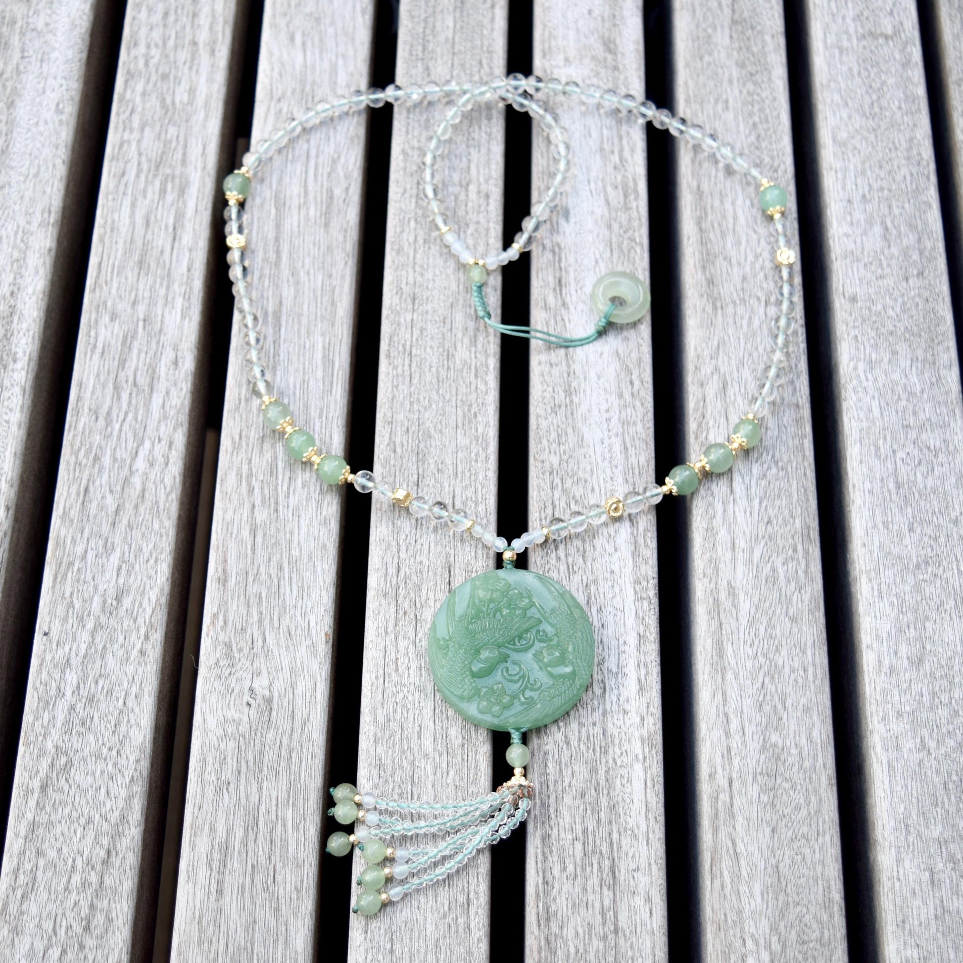 These 2 green jade necklaces feature circle aventurine pendants carved with Chinese traditional patterns: