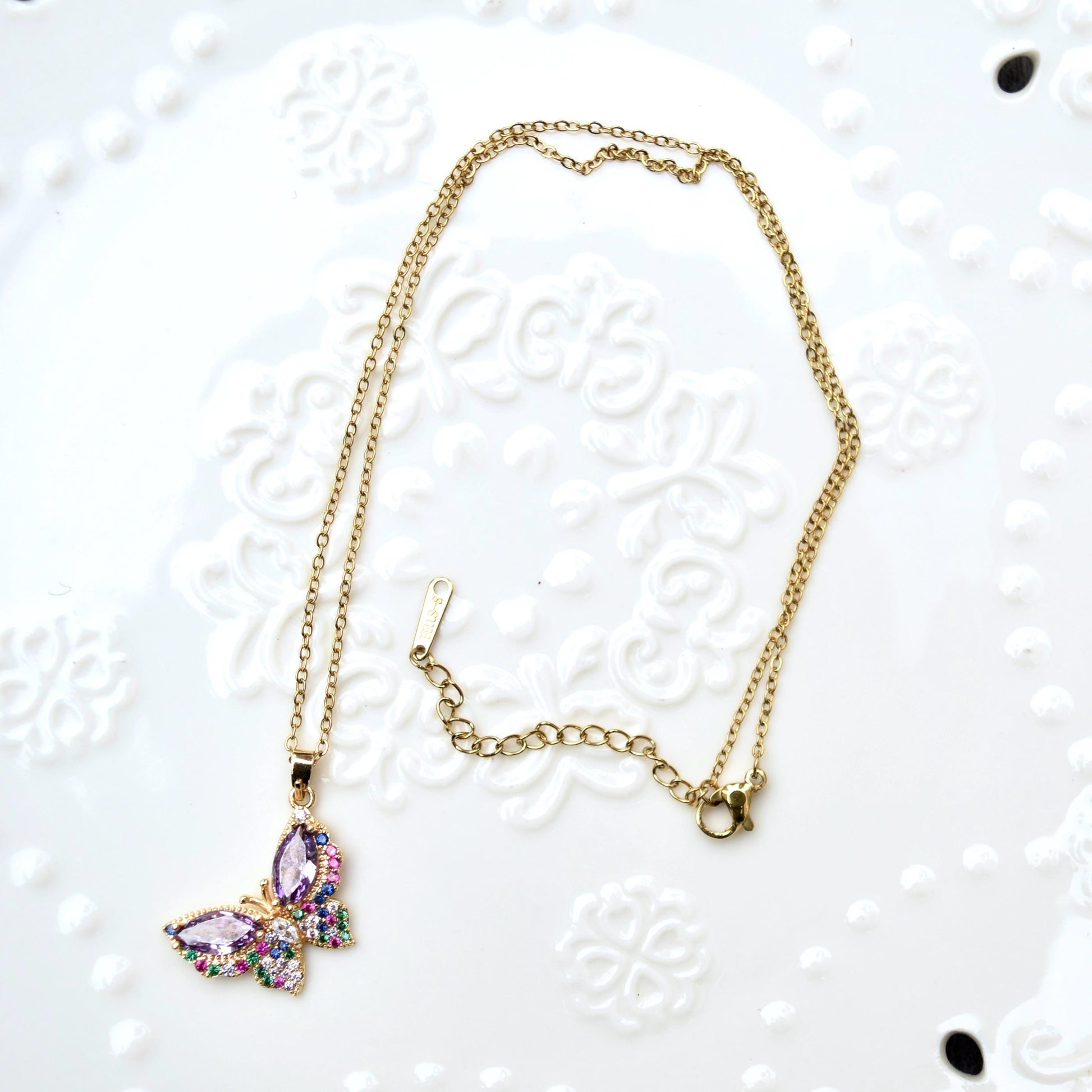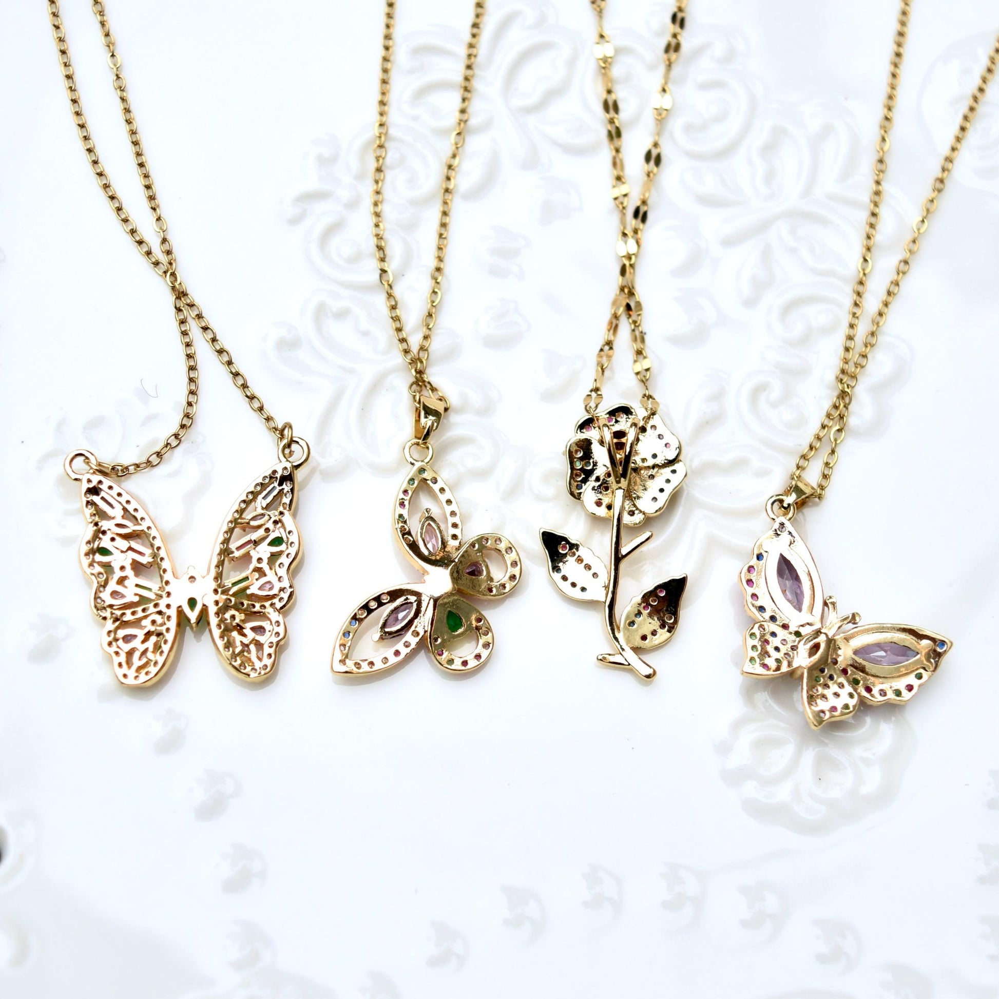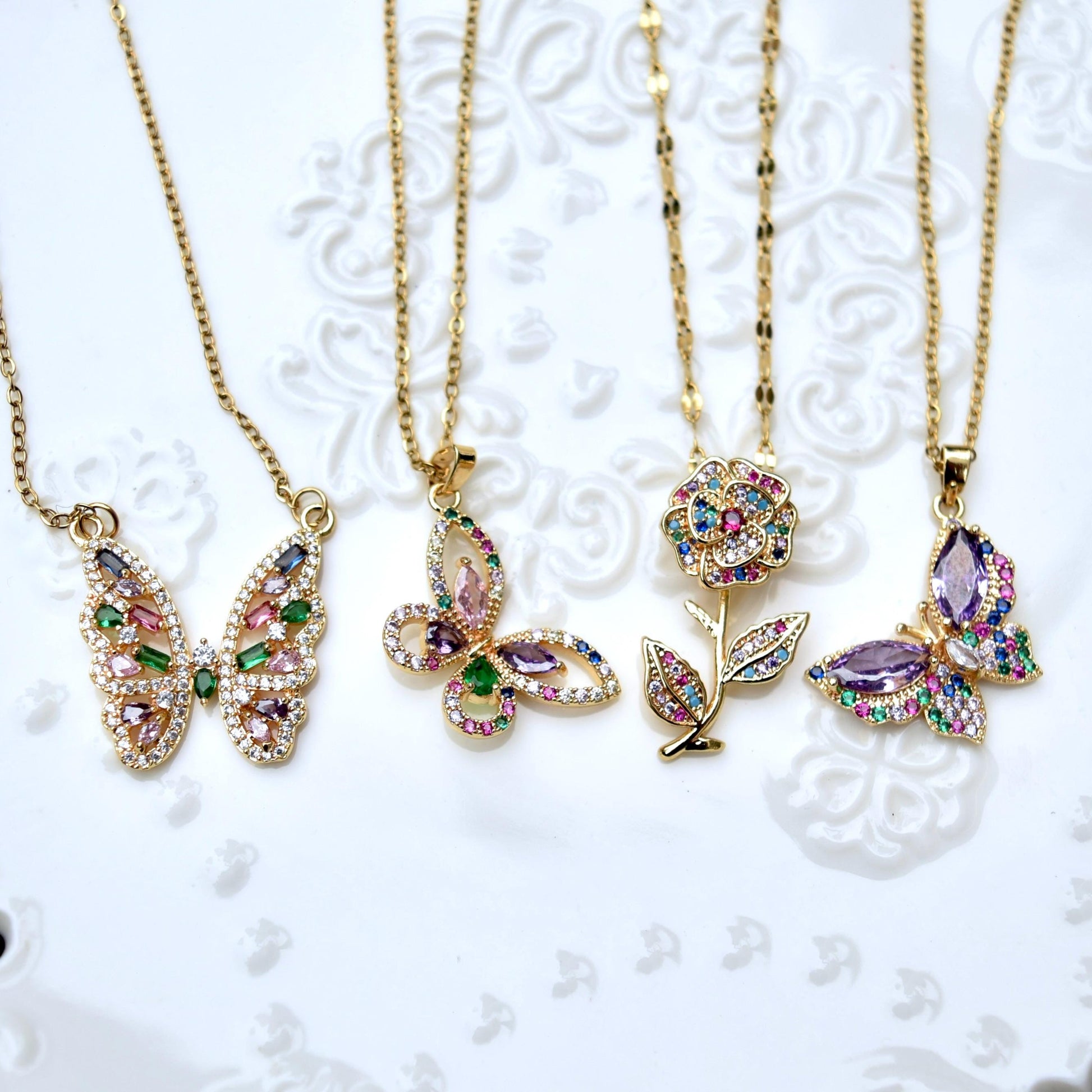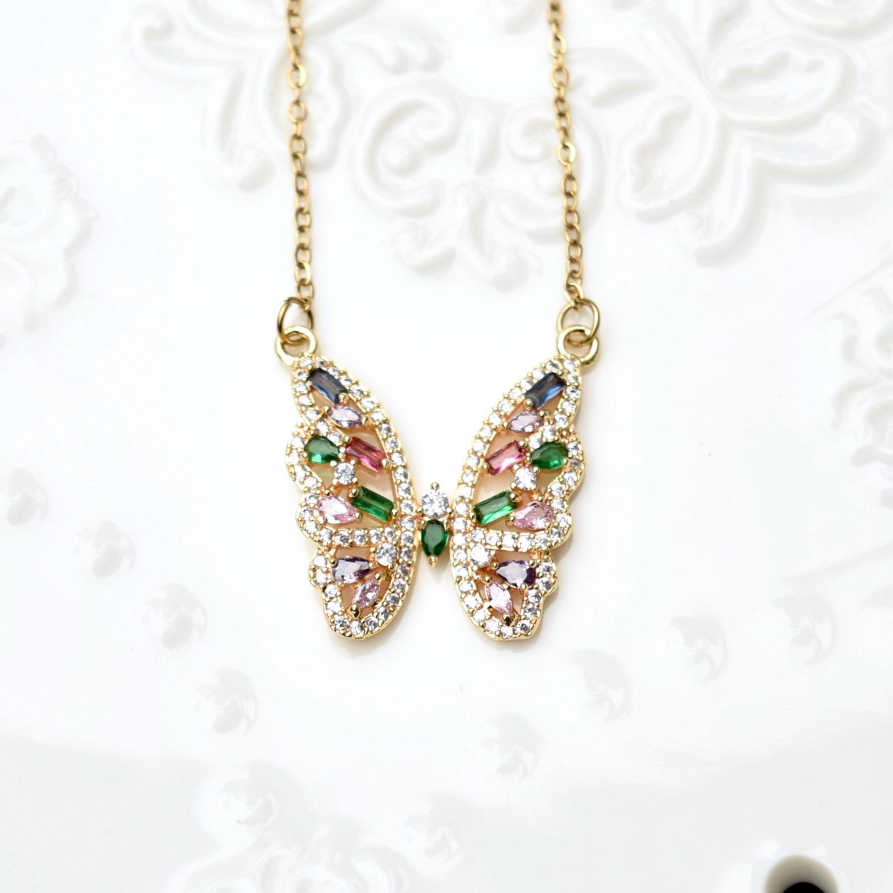 This cute necklace collection features colorful crystal butterfly or rose, made of CZ diamonds and gold plated findings. The paired chain is made of gold plated stainless steel with wonderful color retention. It's perfect matching other silver necklaces as layered jewelry and you can wear this necklace daily or on special occasions! Also making a wonderful gifts for her on holiday!