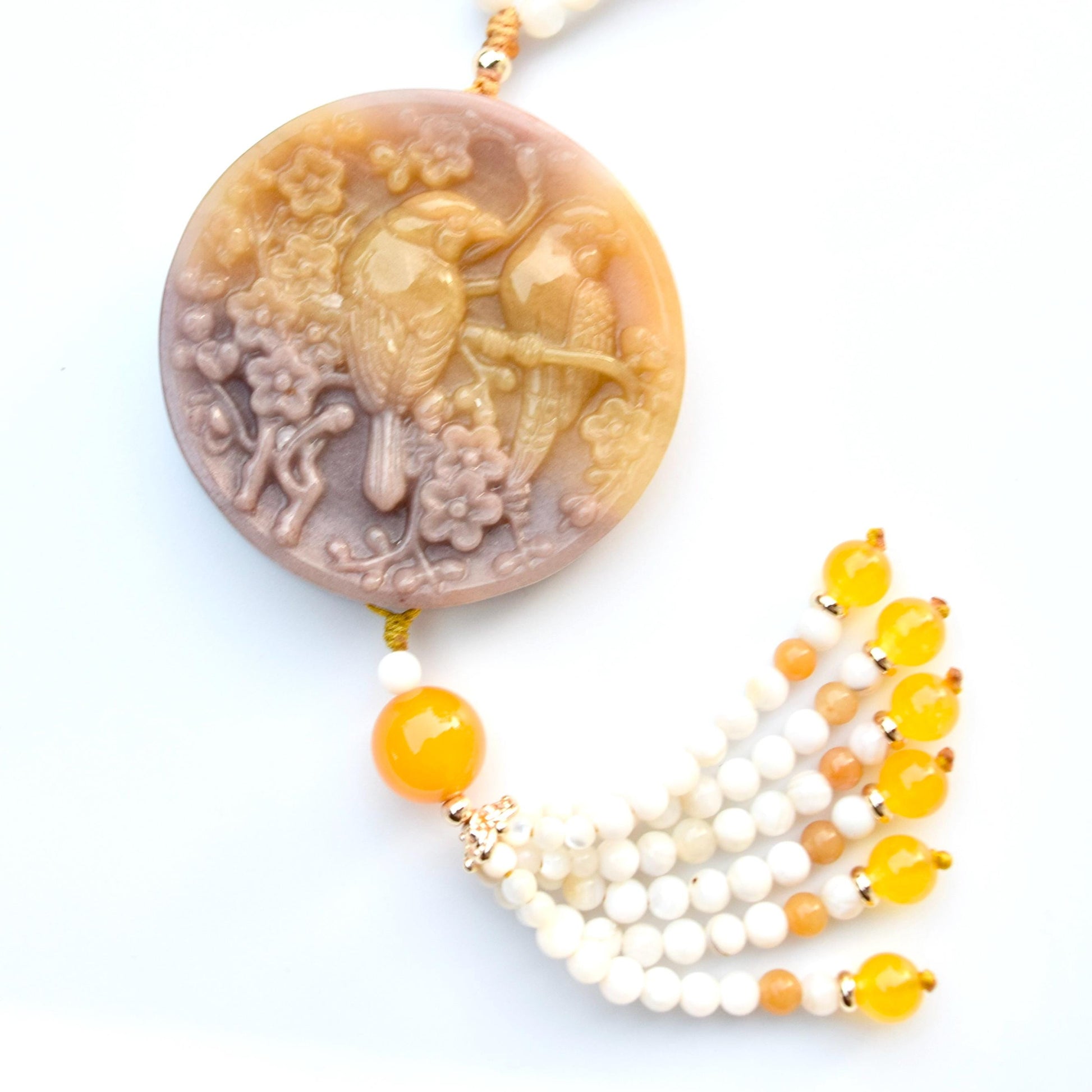 This delicate braided necklace features birds-patterned quartz jade pendant. The paired beads are made of yellow jade and white agate beads. The yellow tone creates a sweet and fresh style and is perfect for someone with a girly heart!