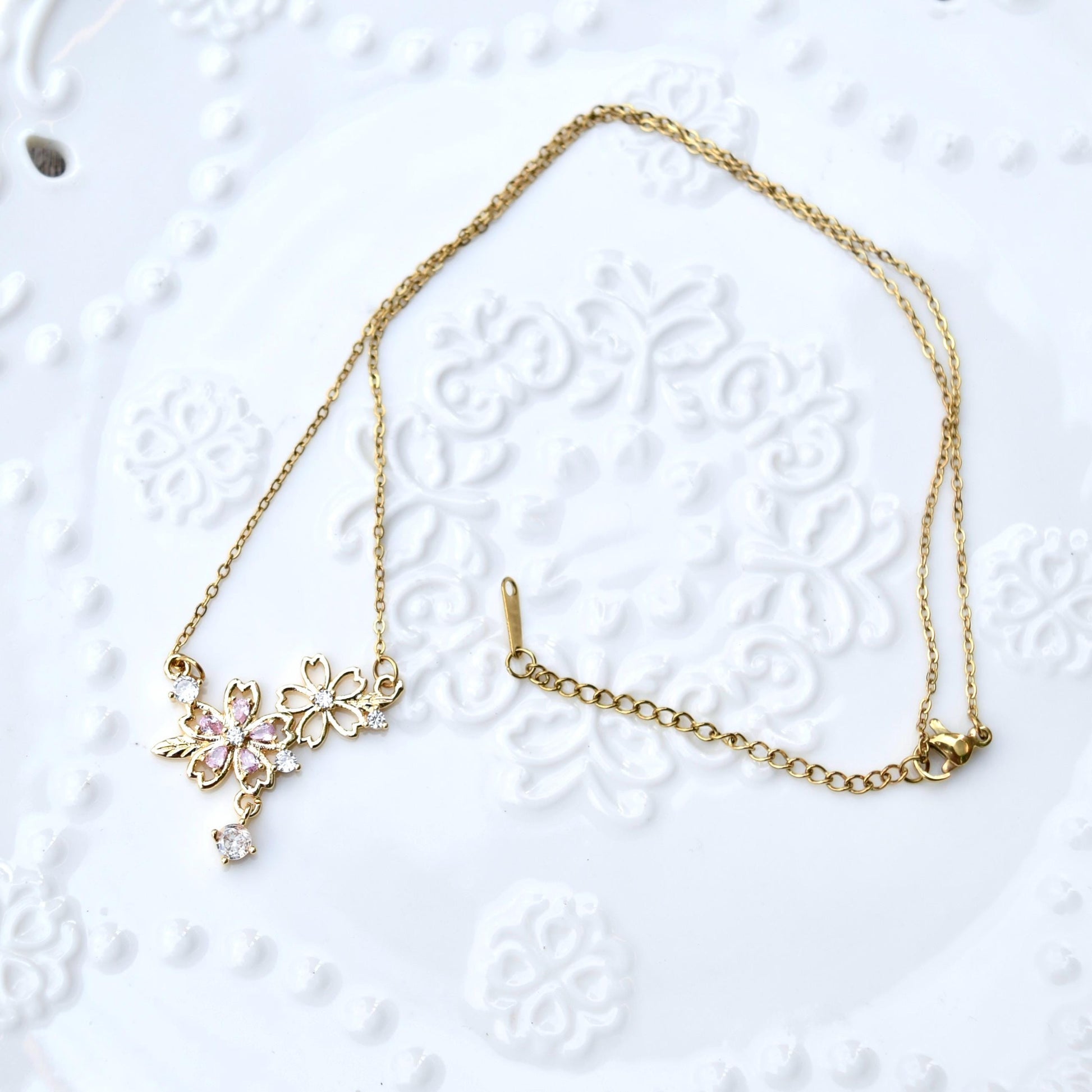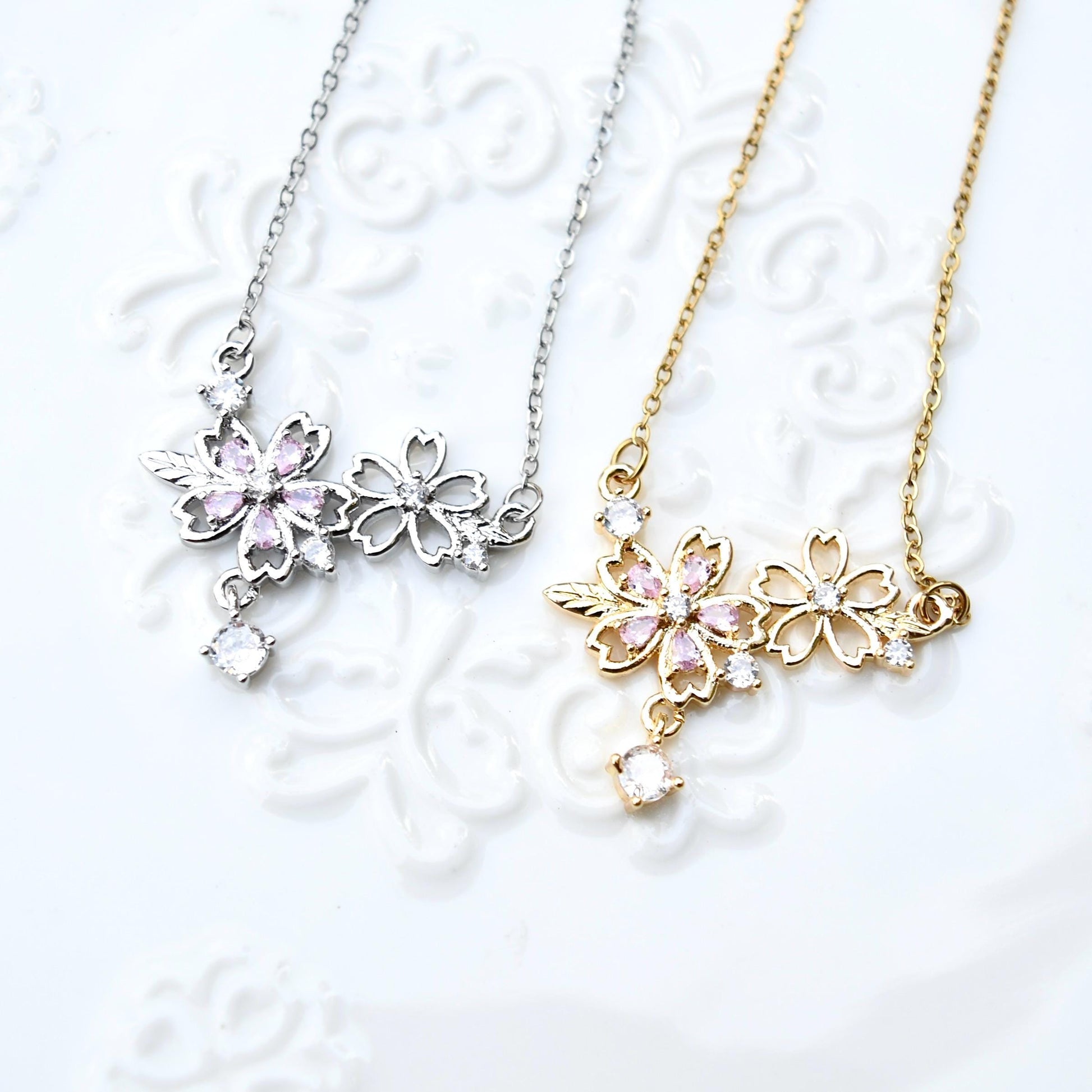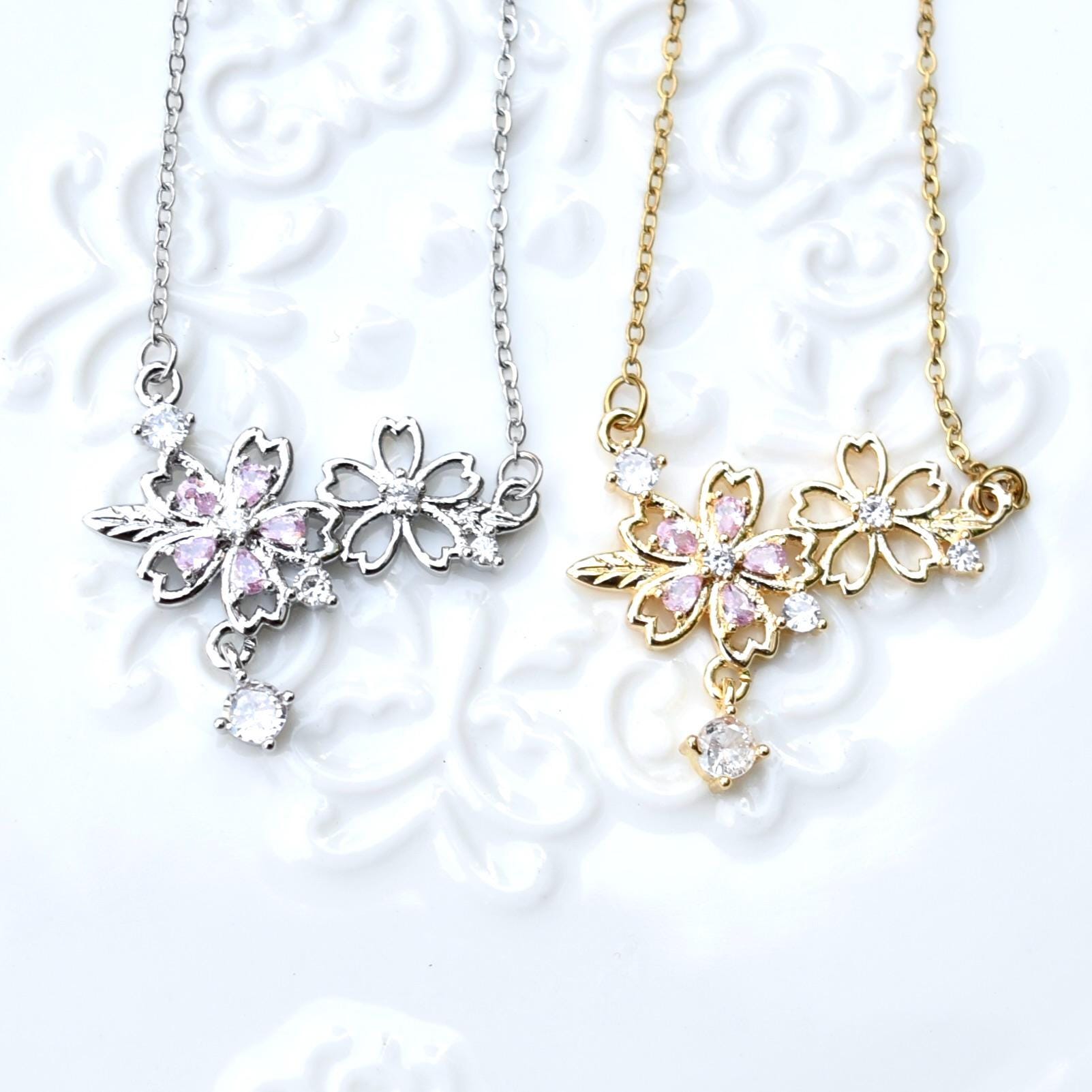 š· This cute necklace collection features pink CZ stones set in sakura charm.