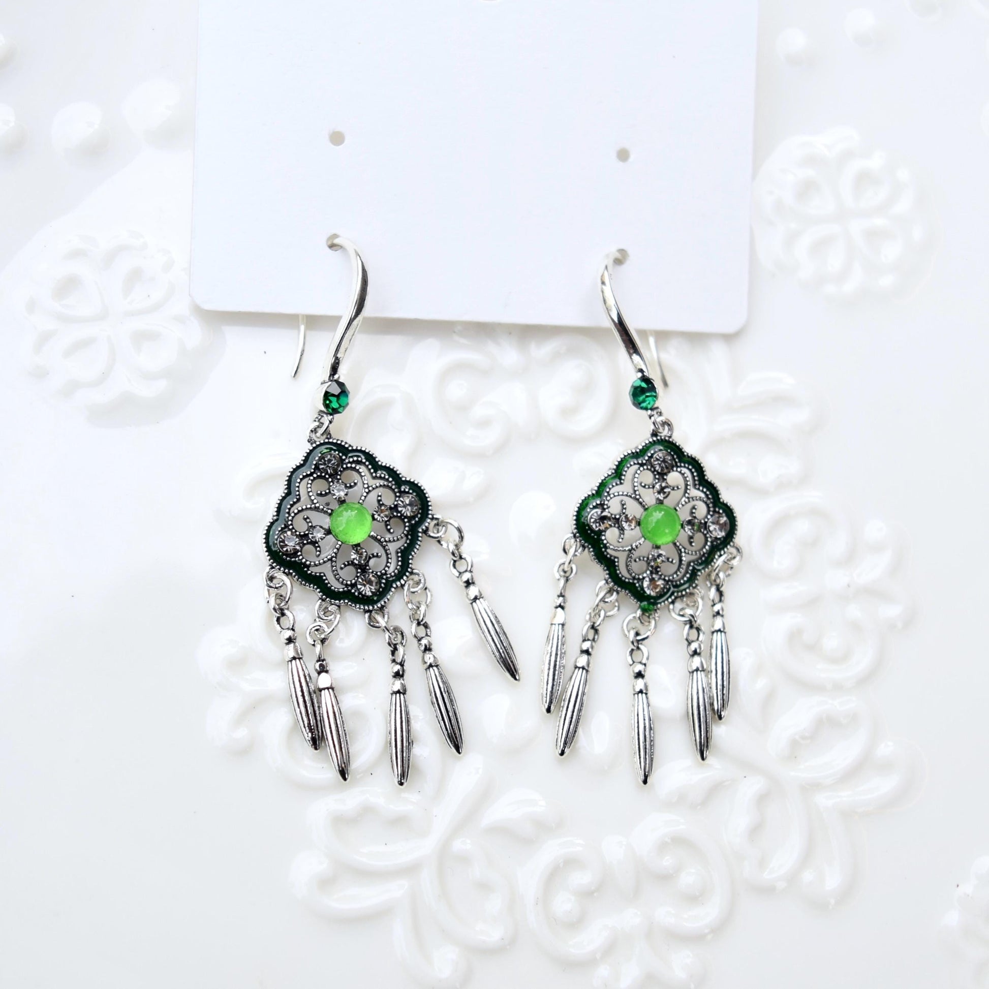 Dreamcatcher Green Crystals Earrings - Vintage Style Earrings