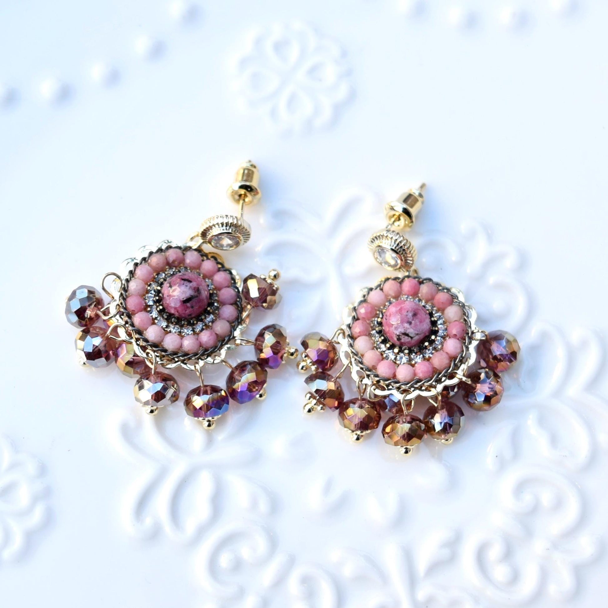 Dreamcatcher Purple Pink Crystals Stones Earrings