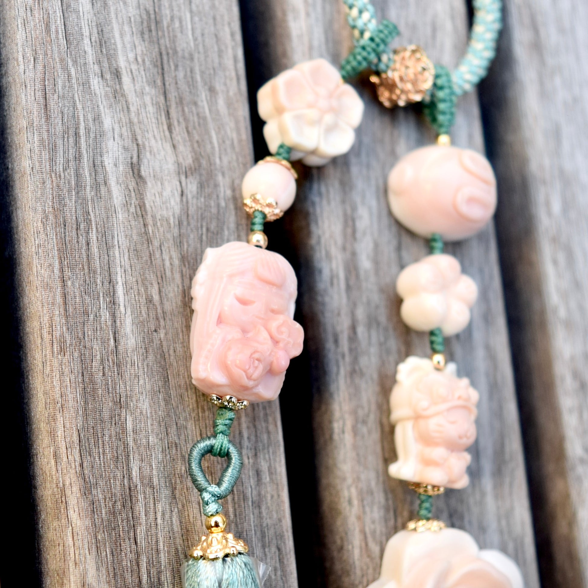 This accessory features natural queen conch pendants with cute themes. The pendants are carved as fairy, flowers, rabbit and lion. The soft pink-orange tone creates a sweet and fresh style and is perfect for someone with a girly heart!