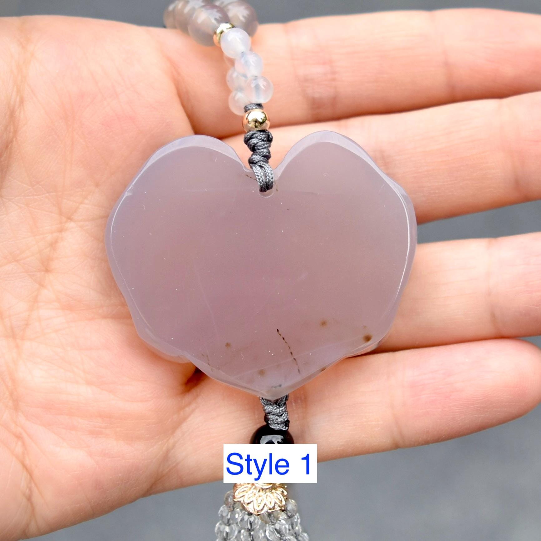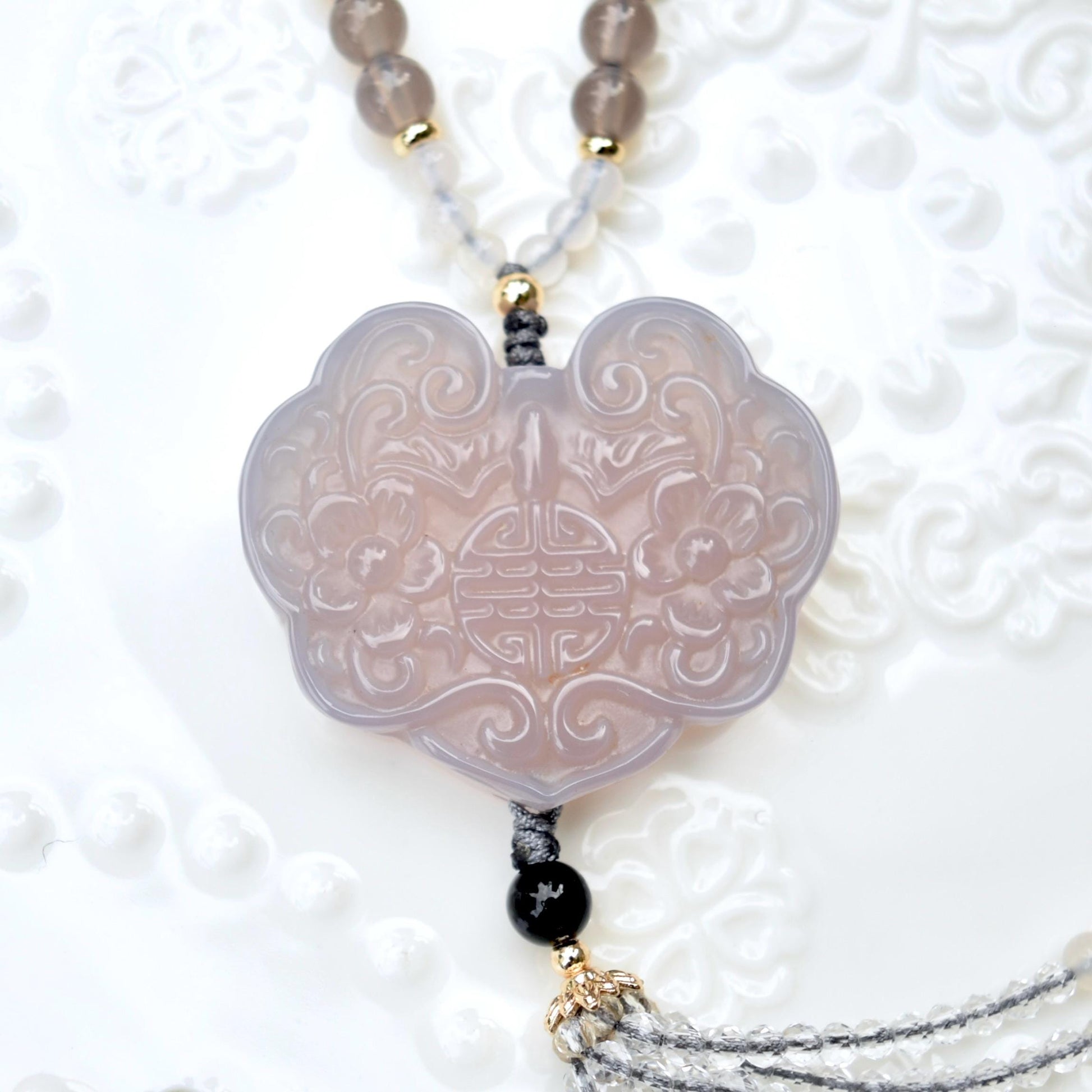 Designed as Chinese flora lock, this featured pendant is made of natural gray agate. The paired necklace is braided with natural gray and black agate beads and high-quality cords. The overall design embodies implicit and plain style. So this conch braided cord necklace is a wonderful jewelry to wear every day.