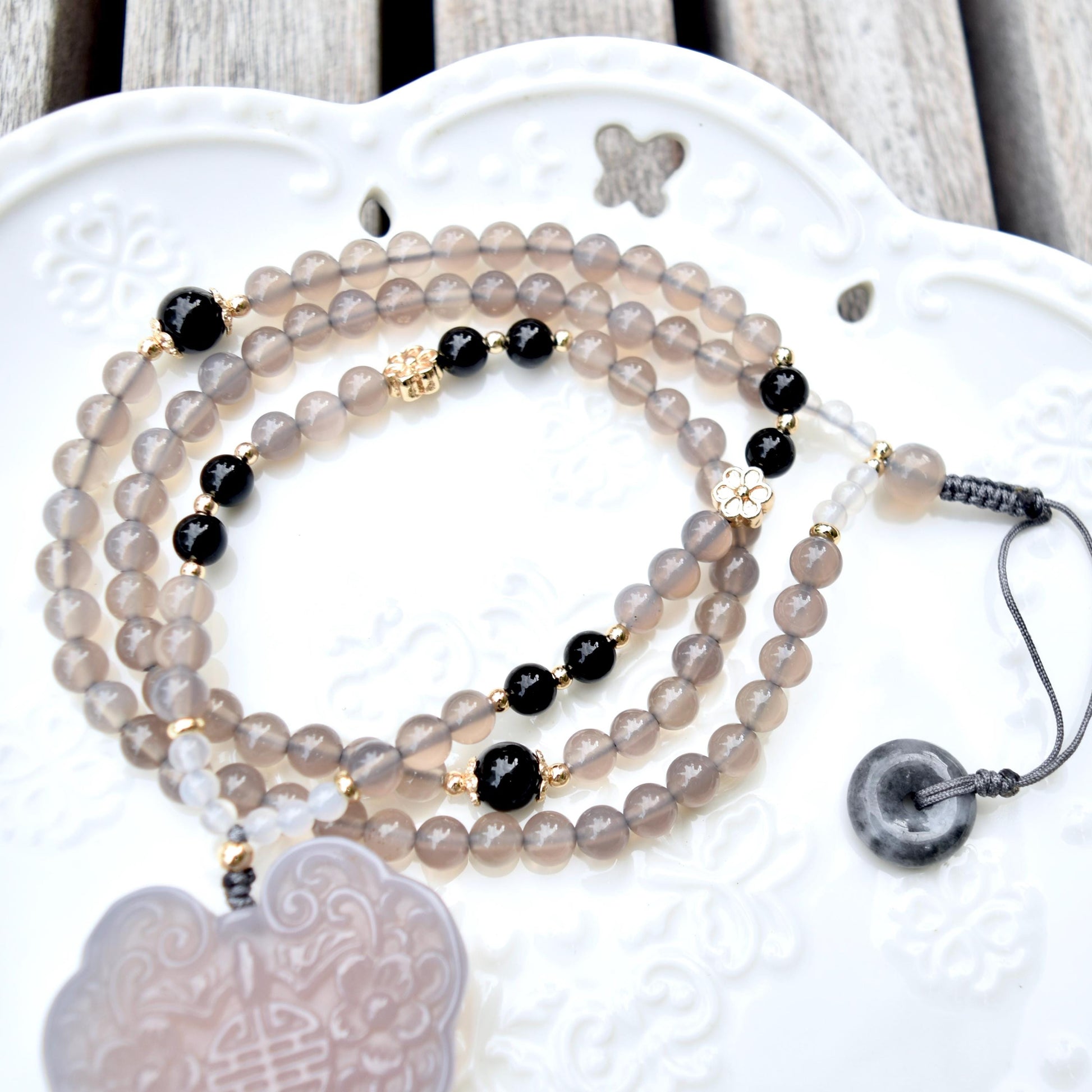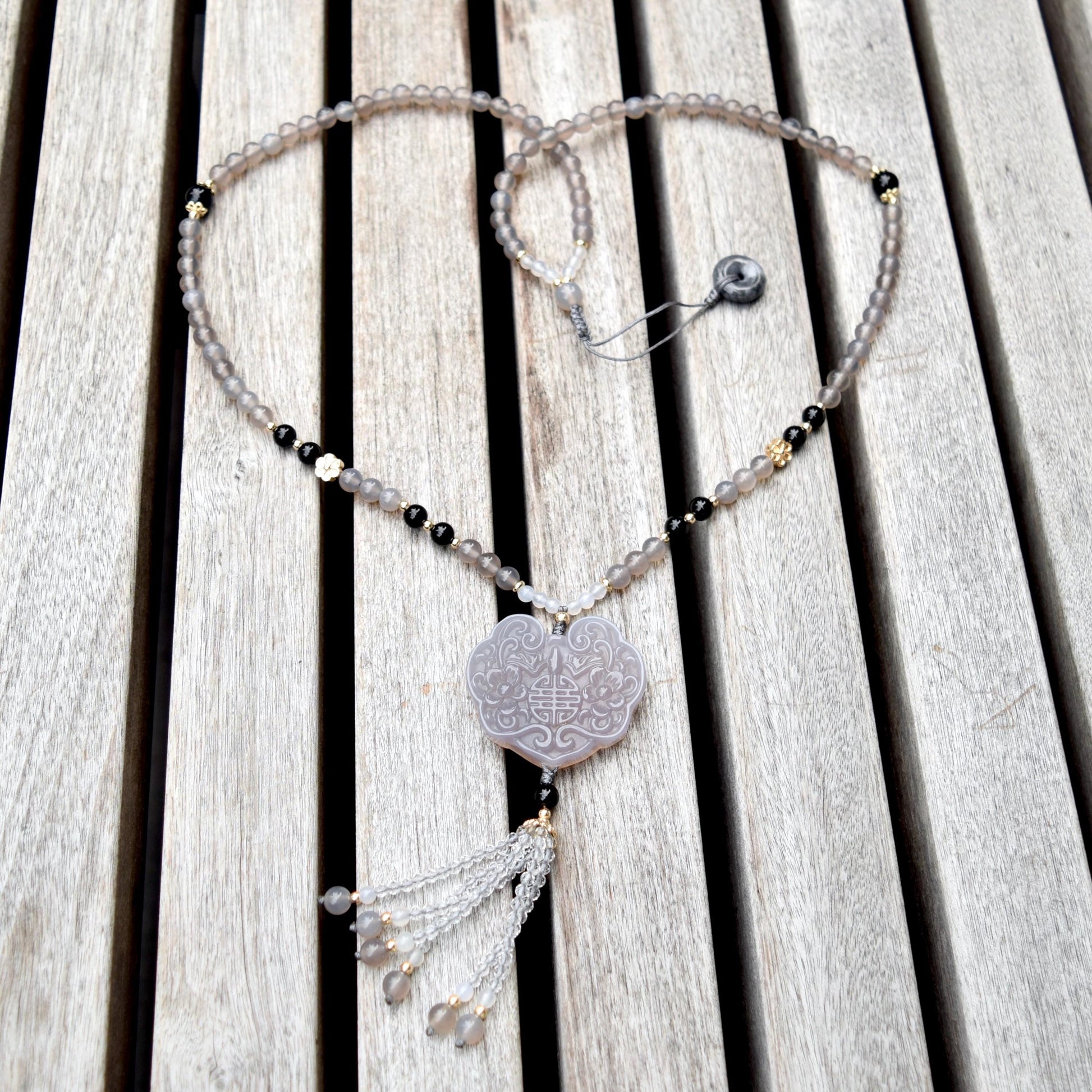 Gray Agate Flora Lock Pendant Beaded Necklace