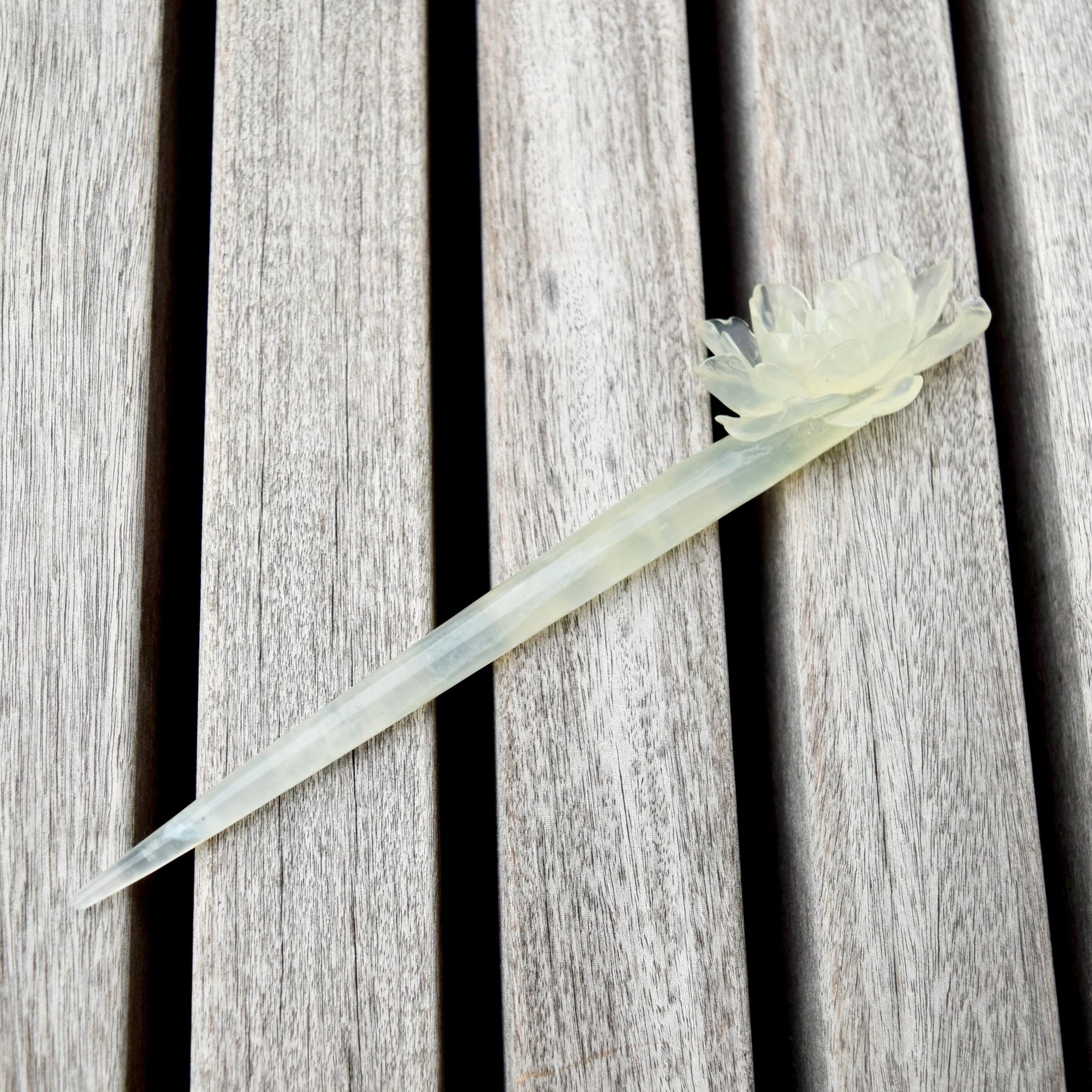 Green Icy Peony Carved Hairpin - Serpentine Jade Hair Stick