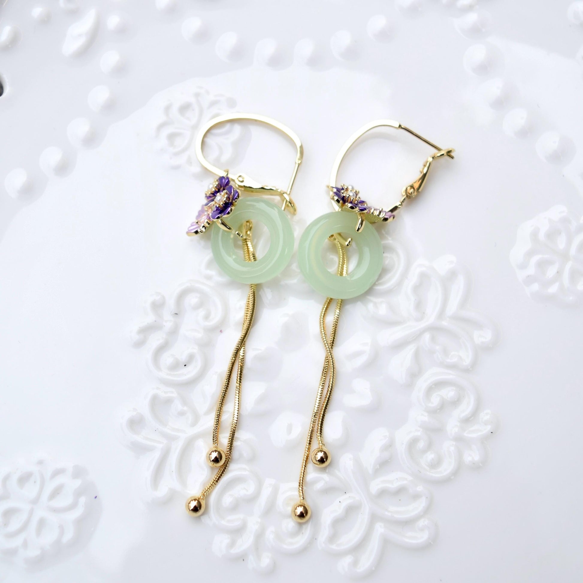 This pair of earrings features jade-like donut charms. In the jewelry category, jade donut charm also has a special name called "Peace Buckle" (平安扣), including auspicious meanings of safety and peace.