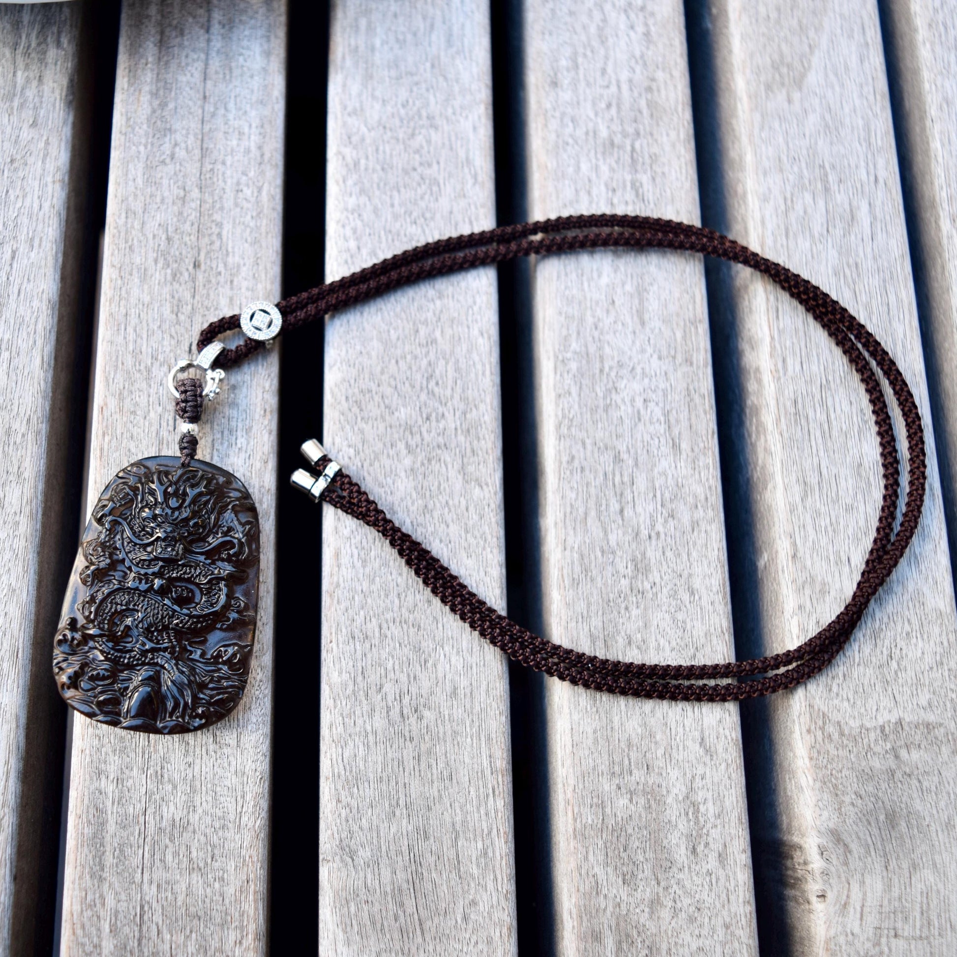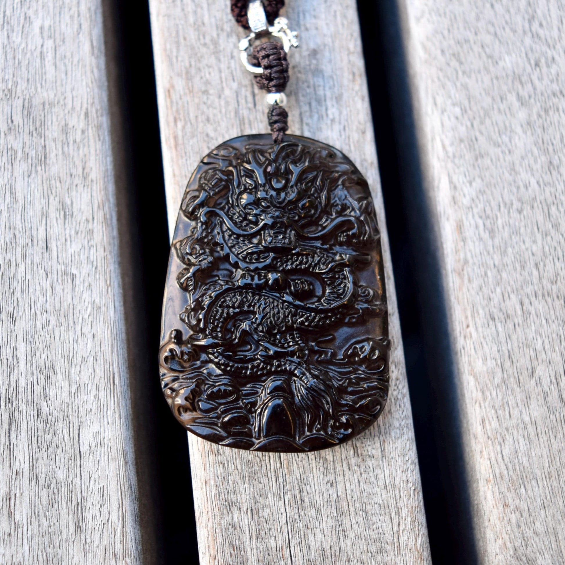 This featured pendant is carved as Chinese dragon. It is made of obsidian with icy and clear appearance.