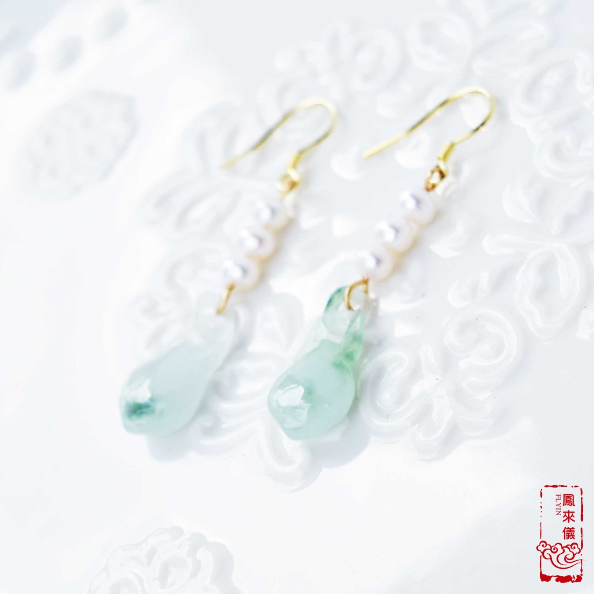 This pair of dangle earrings features cute gourd-shaped jade pendants, paired with freshwater pearl beads. The bottle gourd is called “Hu-Lu”(葫蘆) in Chinese, the homophony of "Fu-Lu"(福祿), and means good luck and wealth in Chinese culture. The pearl is a symbol of health, longevity and wealth. So these earrings express lots of blessings.