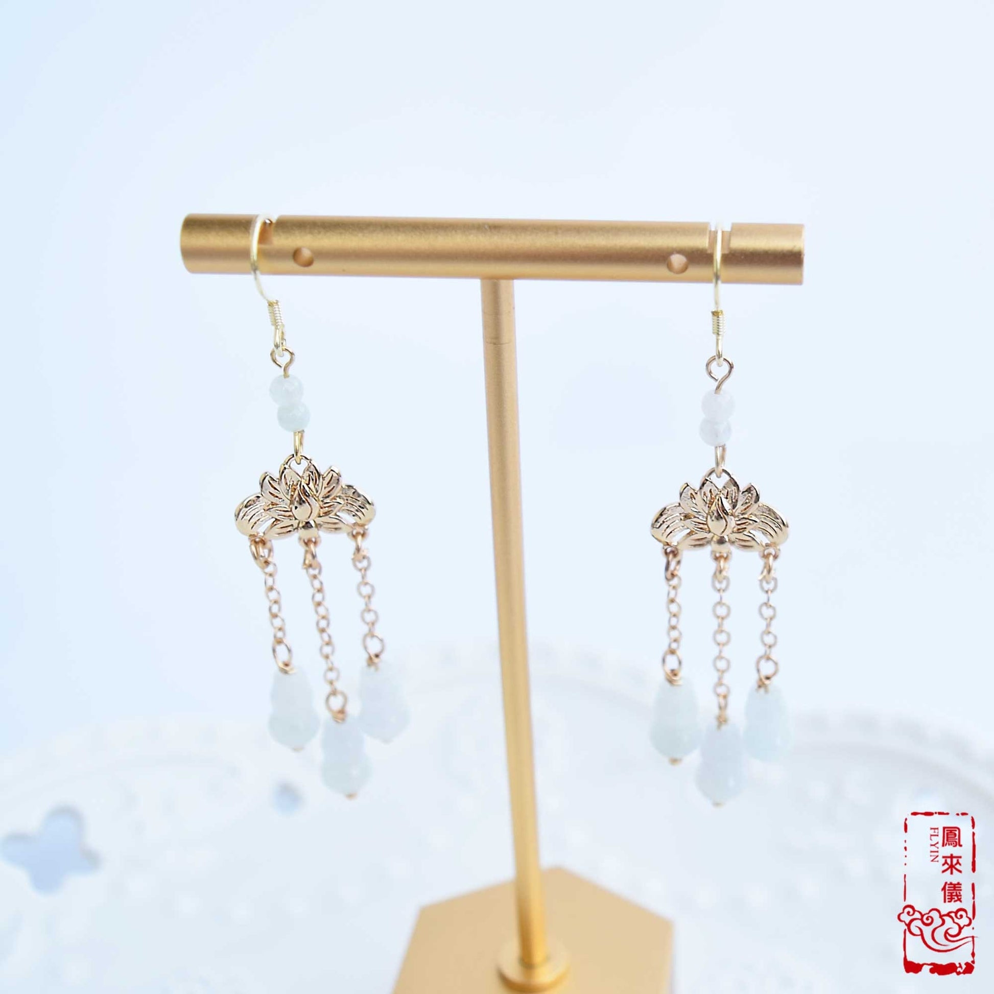 The metal part is a golden lotus, symbolizing the perfection and purity of both the heart and mind. So these earrings express lots of blessings.