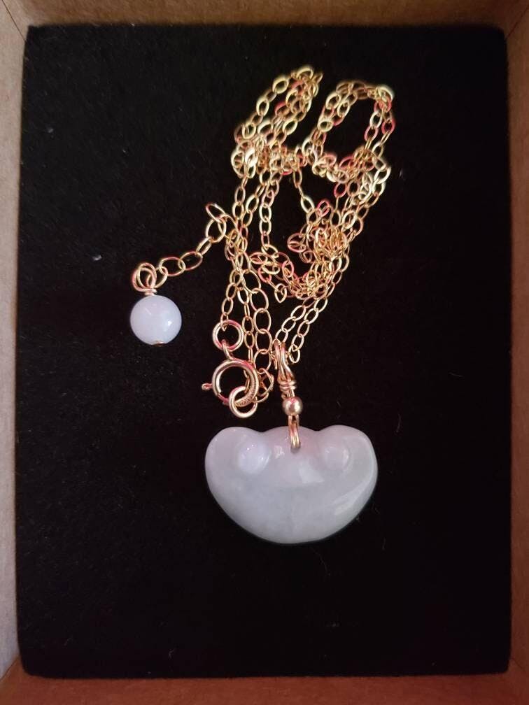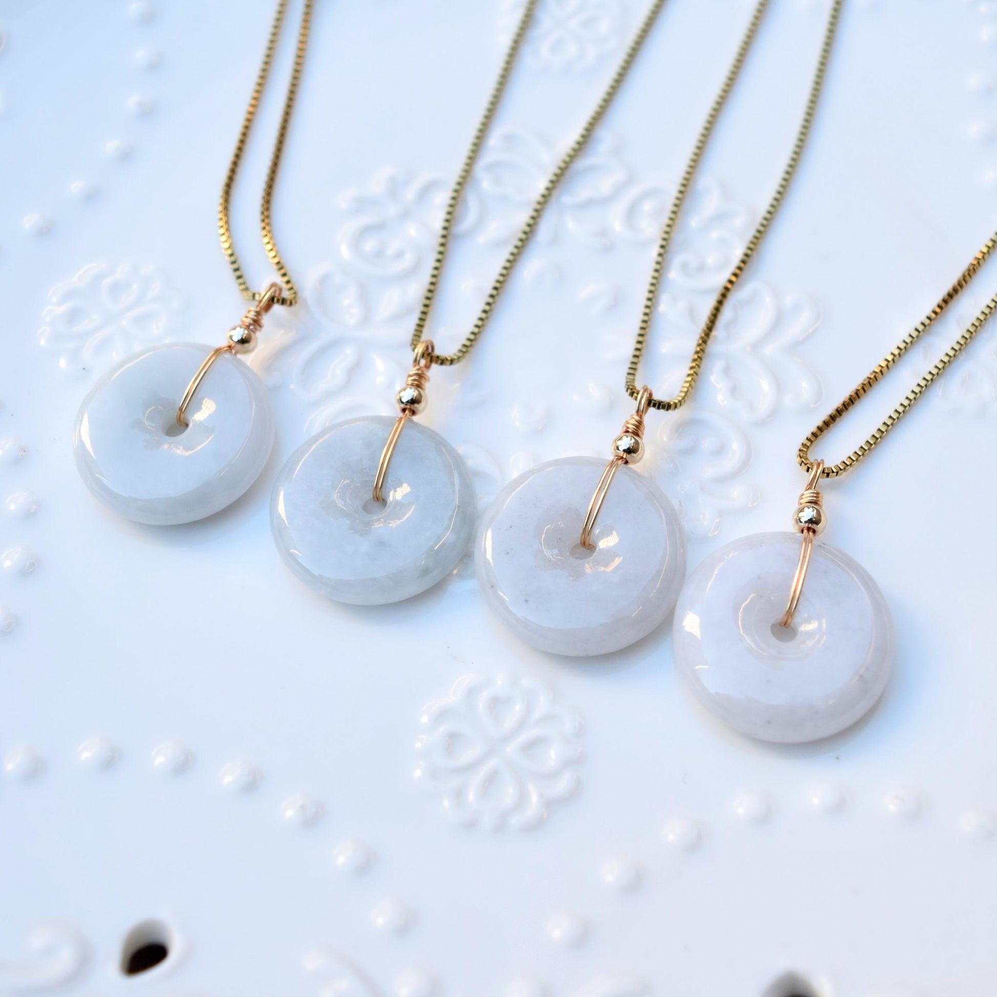 This delicate necklace features traditional Chinese symbolic meanings of a jade donut. Made with natural Grade A jadeite, the pendant represents peace, luck, safety, and auspiciousness.