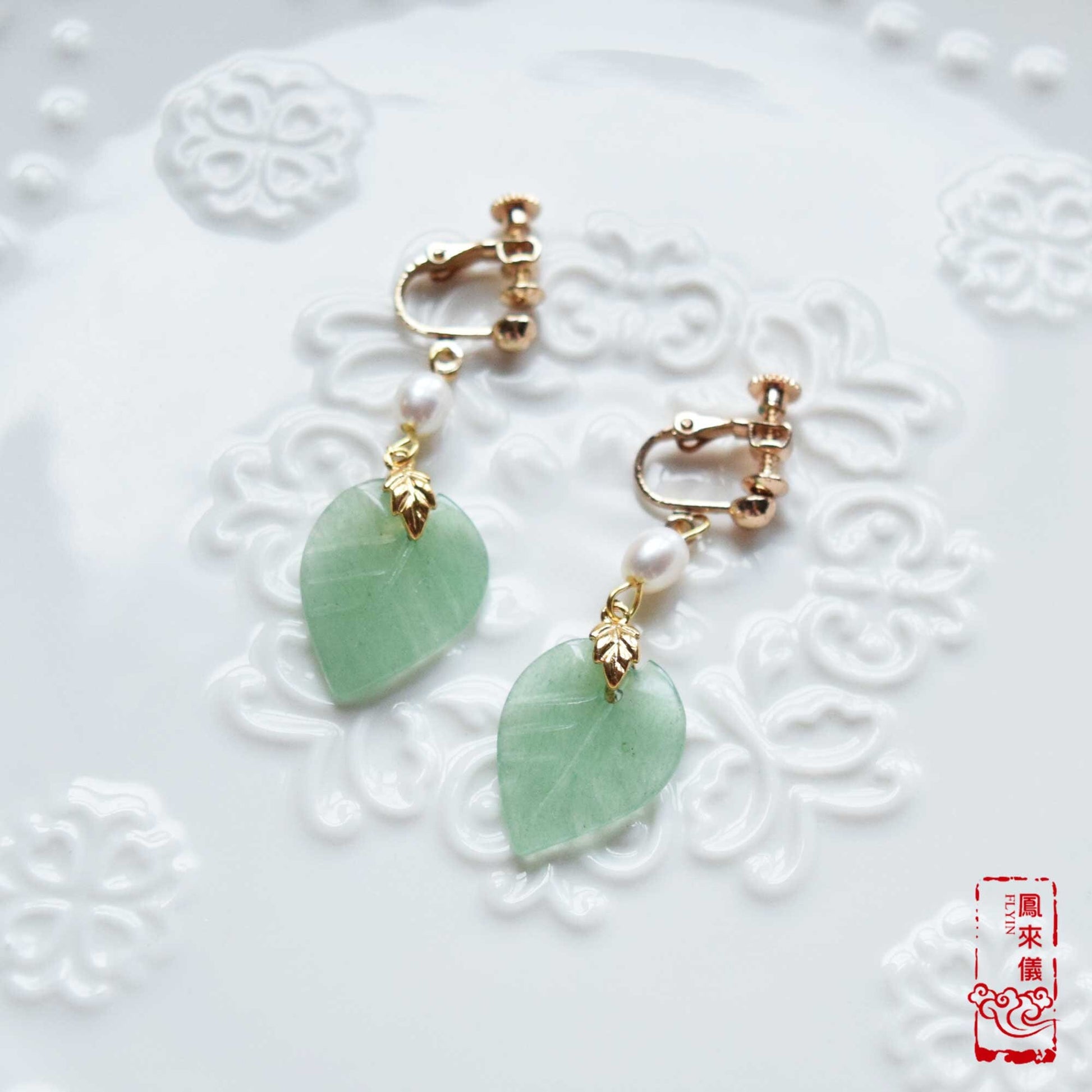 Leaf Jade Green Jade Freshwater Pearl Earrings Chinese Jewelry - Gold Jade Jewerly