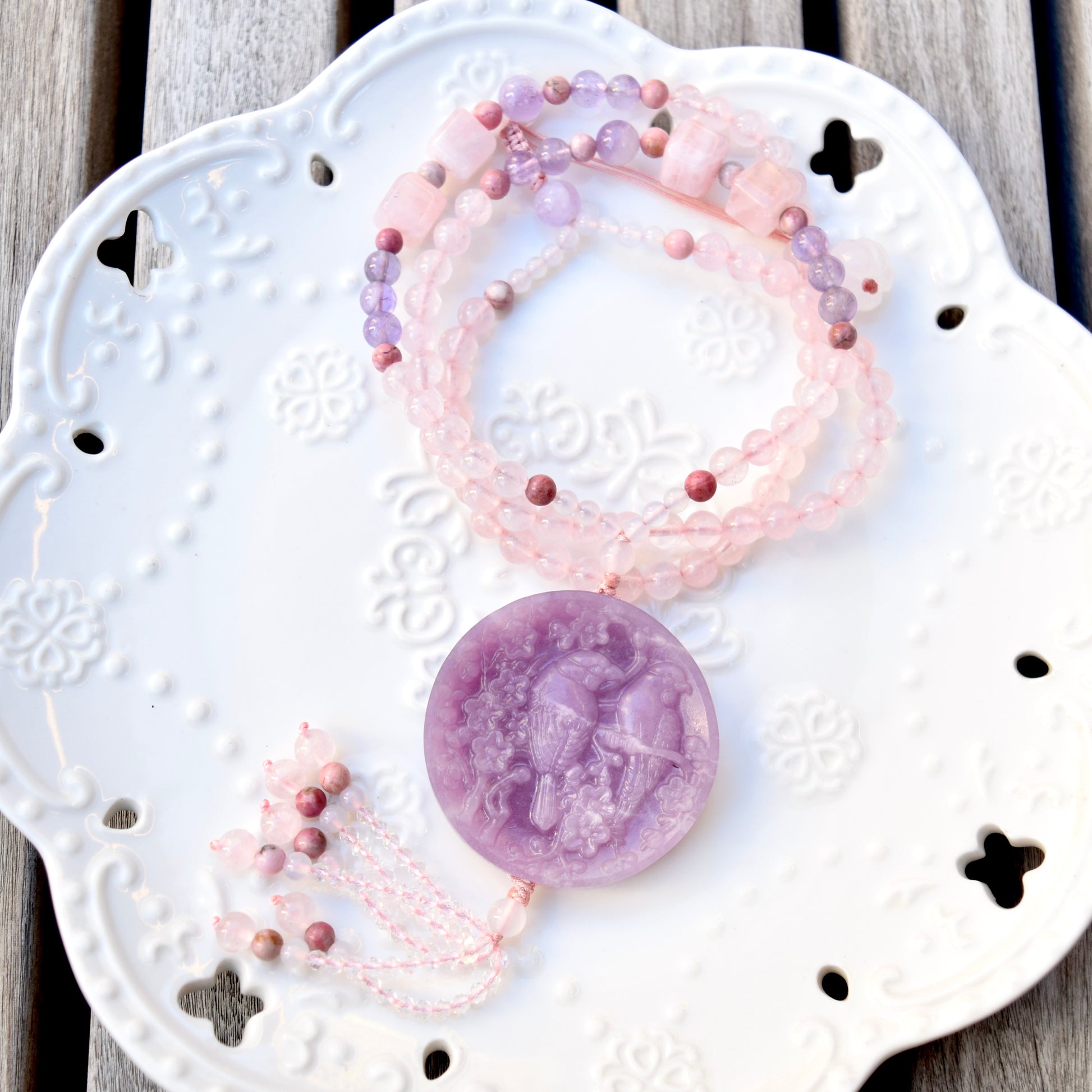 This purple lepidolite pendant is carved with a traditional Chinese pattern: magpies perched on a plum tree branch (喜上眉梢). It symbolizes good fortune and is a perfect gift. The paired necklace is braided with white agate, rose quartz and amethyst beads. The overall design embodies implicit and plain style.