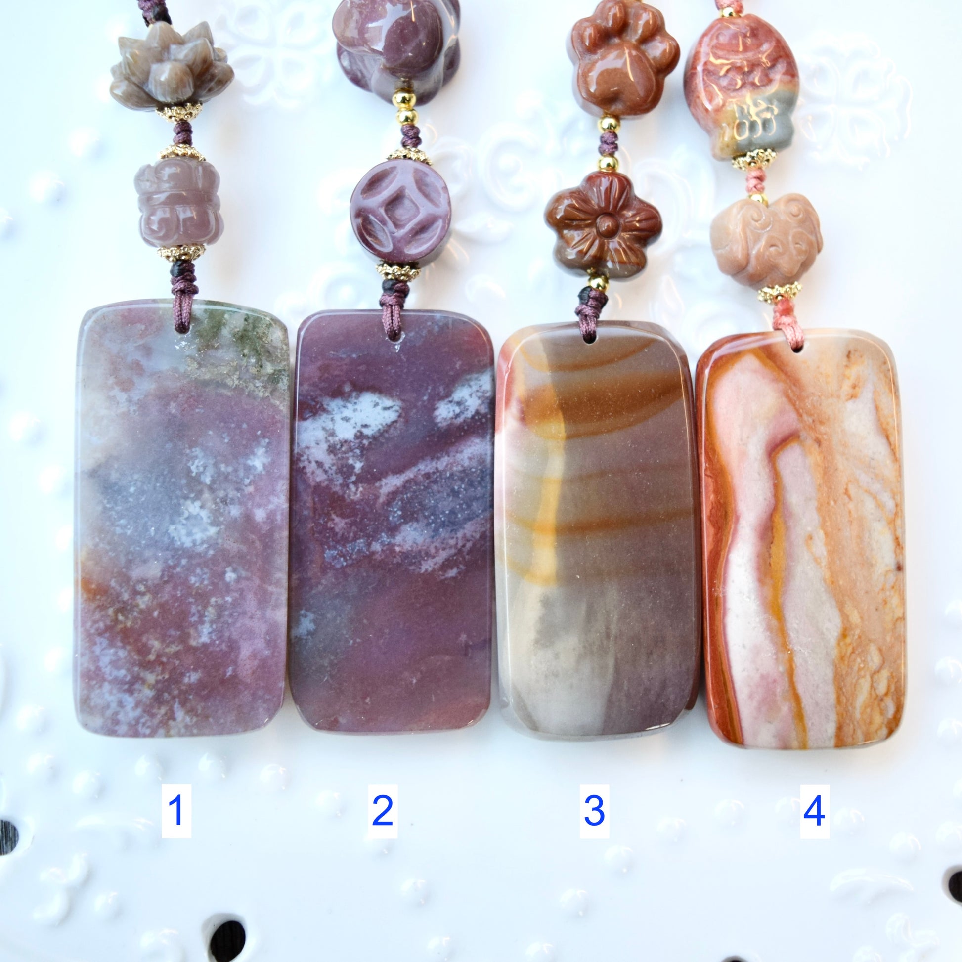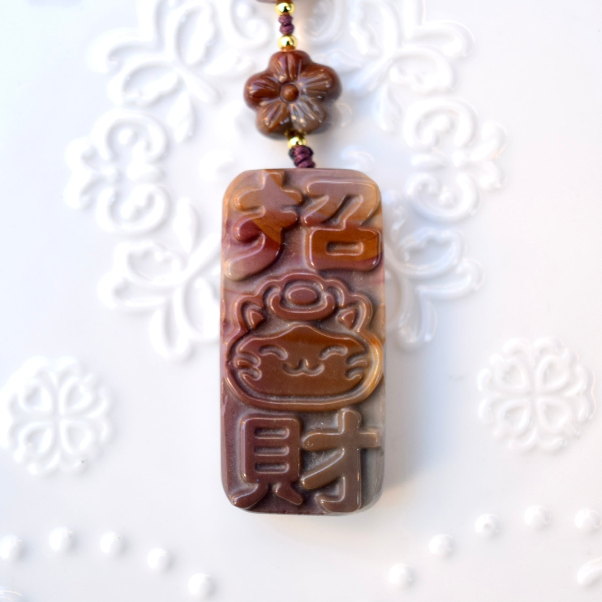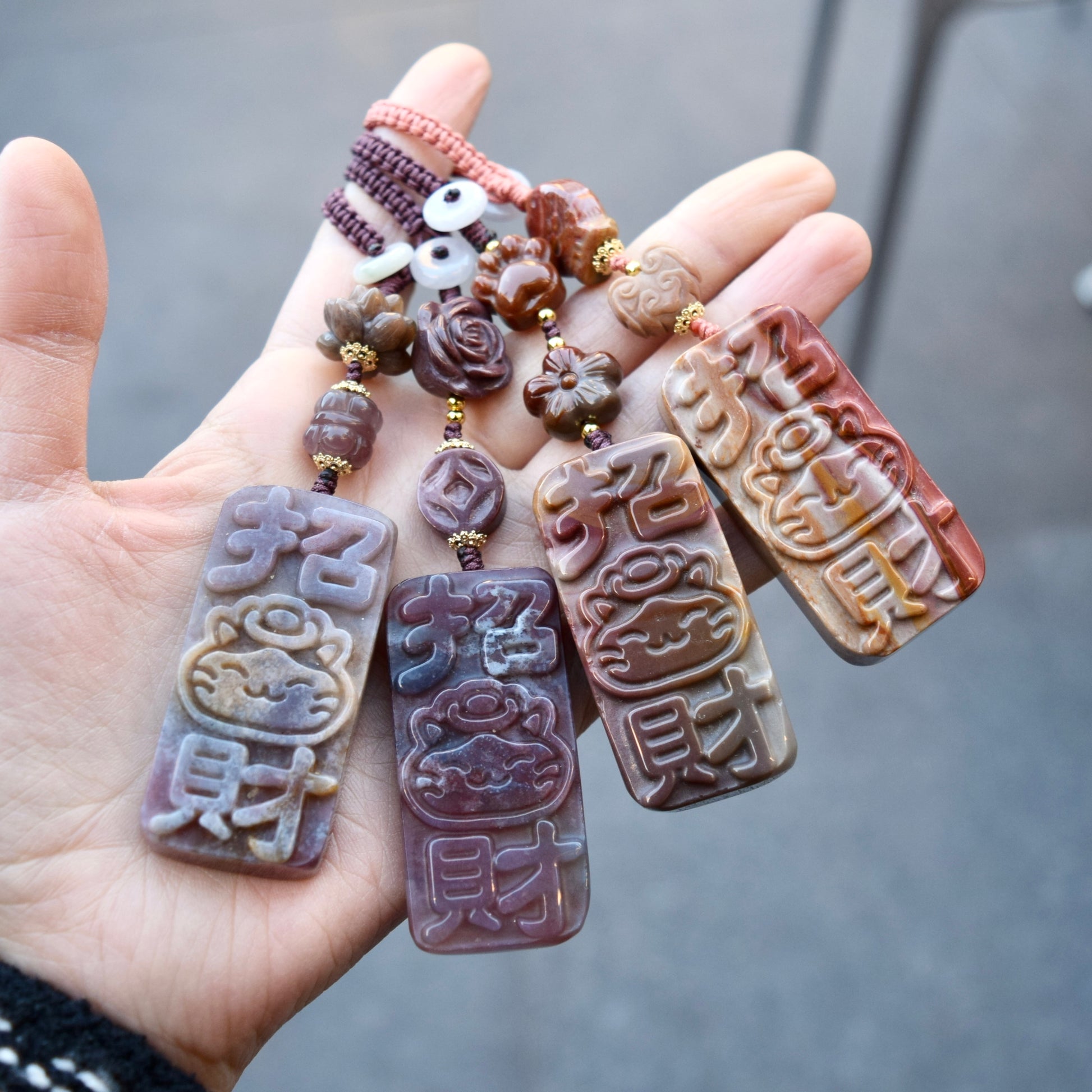 Full of warm wishes and new year atmosphere! The featured pendants are carved as Chinese words "招財" means “bringing wealth”. There are also many cute paired charms, carved as single-lotus, double-lotus, flower, coin, cat paw, fish and ruyi lock. All of them are made from natural jade stones: ocean jasper or polychrome jasper.