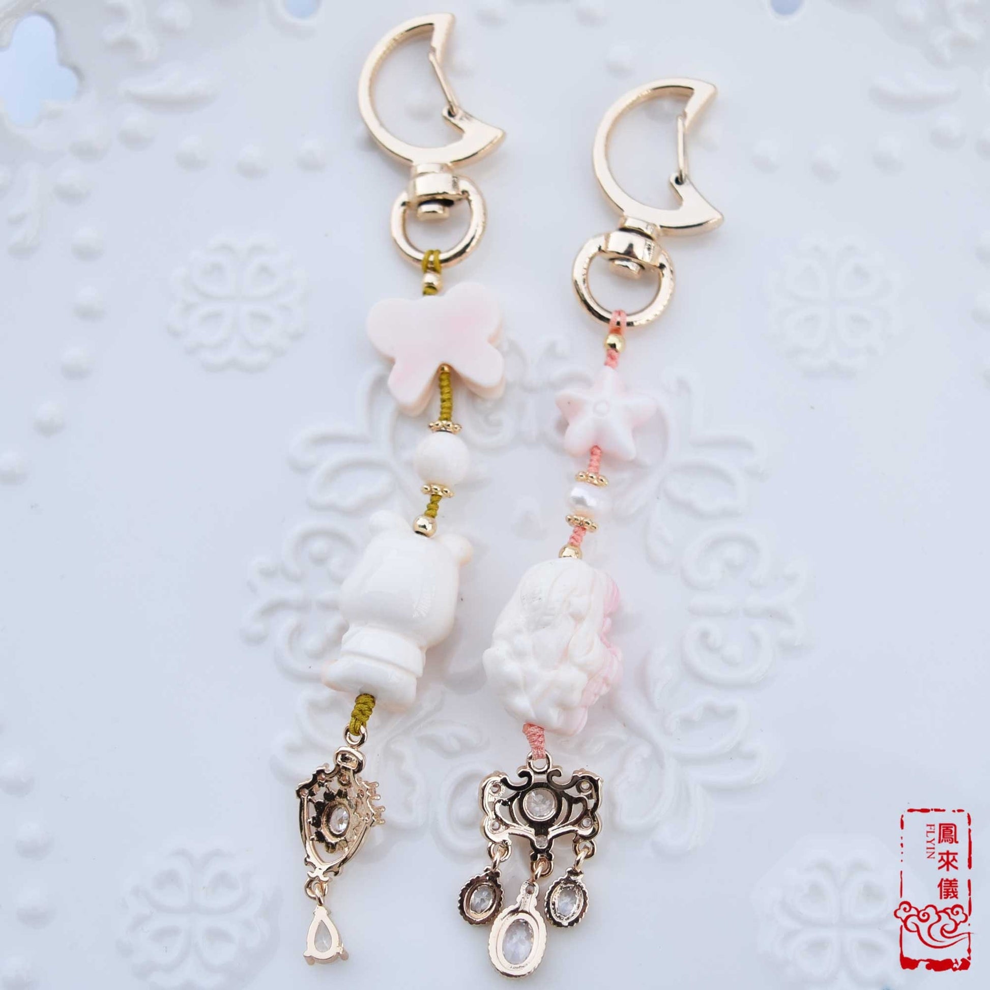 This delicate golden keychain features natural queen conch shell pendant with pink / orange tone. It is carved as cute bear, mermaid, bow and star.