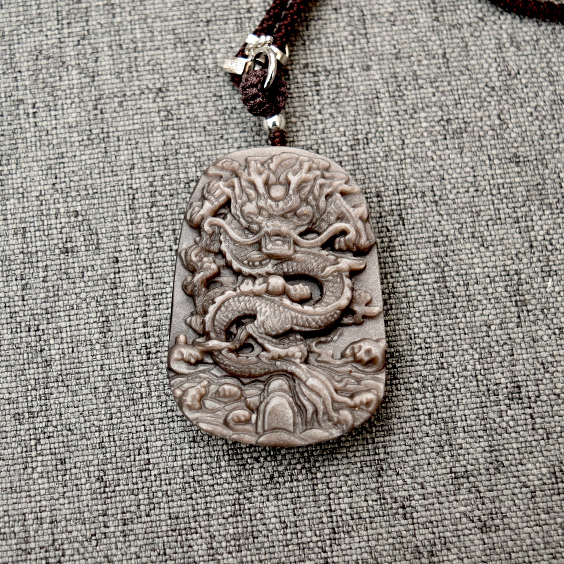 This featured pendant is carved as Chinese dragon. It is made of obsidian with stunning silver glow.