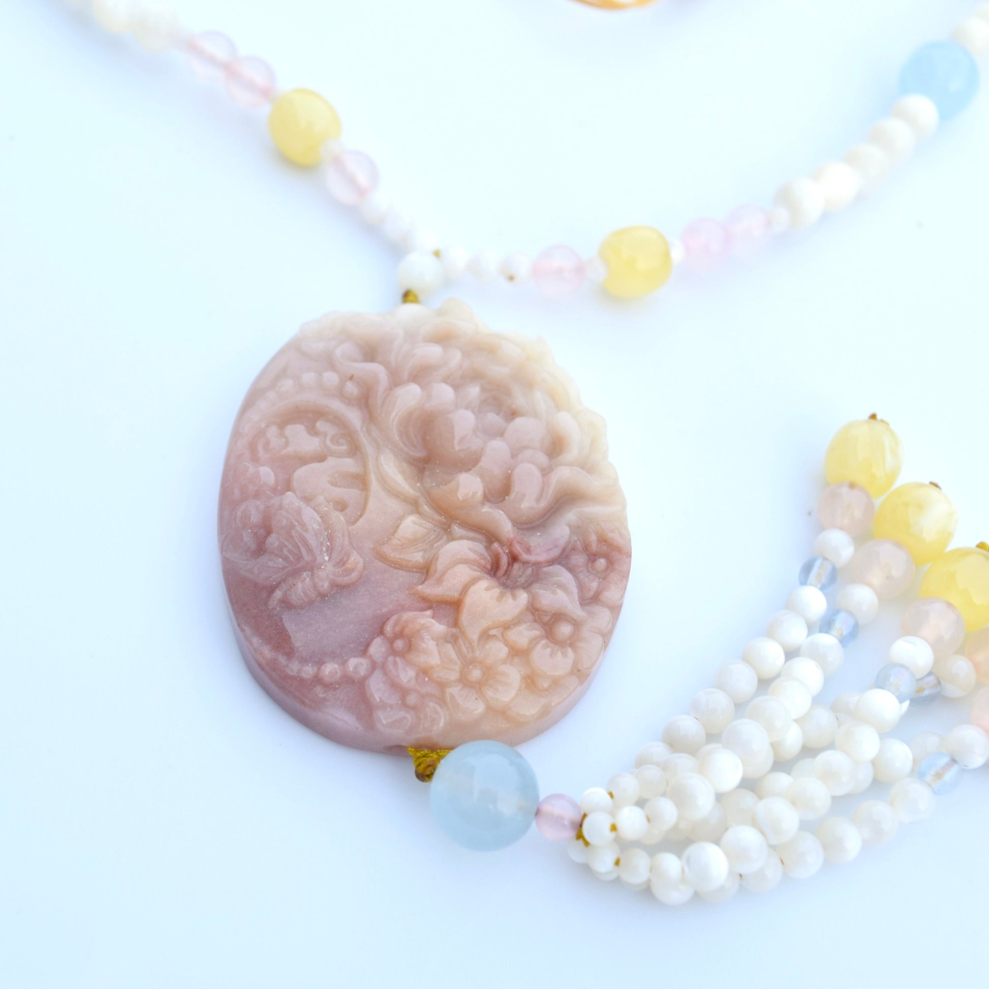 This delicate braided necklace features butterfly-flower-patterned quartz jade pendant. The paired beads are made of white shell and colorful carved beads. The soft-colorful tone creates a sweet and fresh style and is perfect for someone with a girly heart!