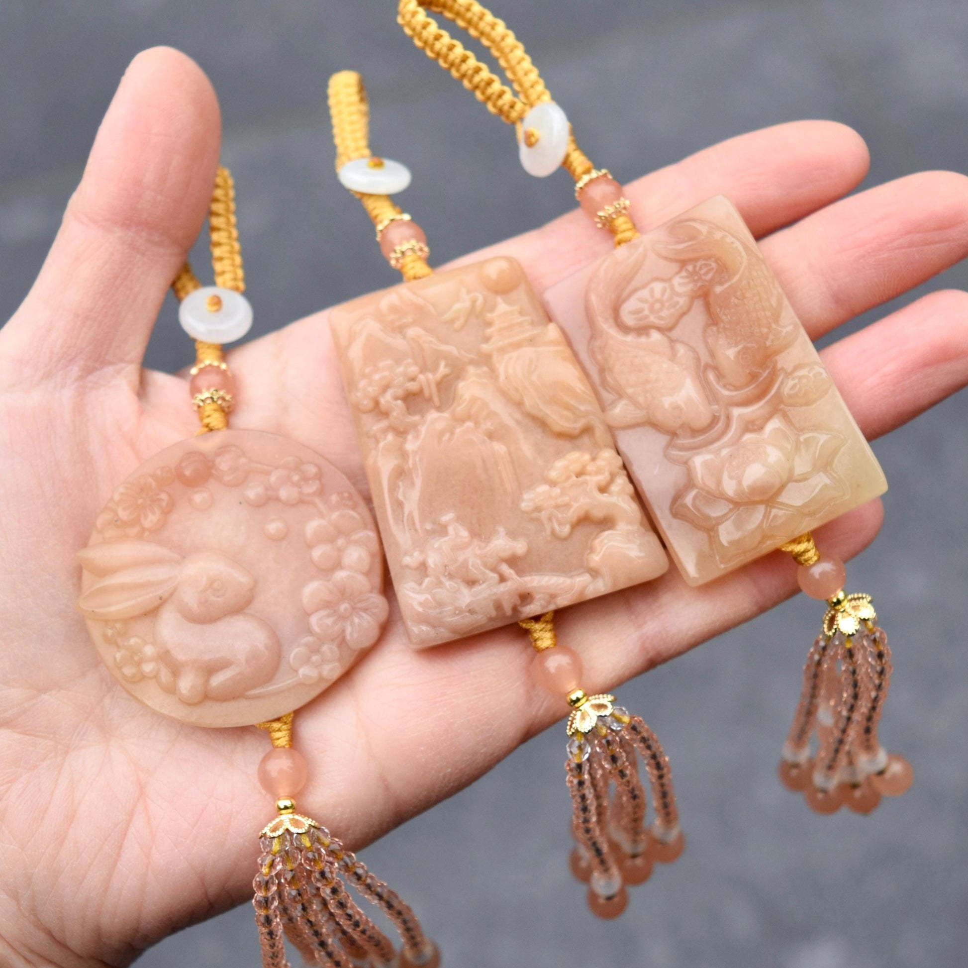Carefully selected natural gemstone connected with exquisite braided craft, creates this delicate braided hanging accessory. The featured pendant shows a Chinese popular decorations: rabbit, landscape (mountain water painting), and lotus fish.