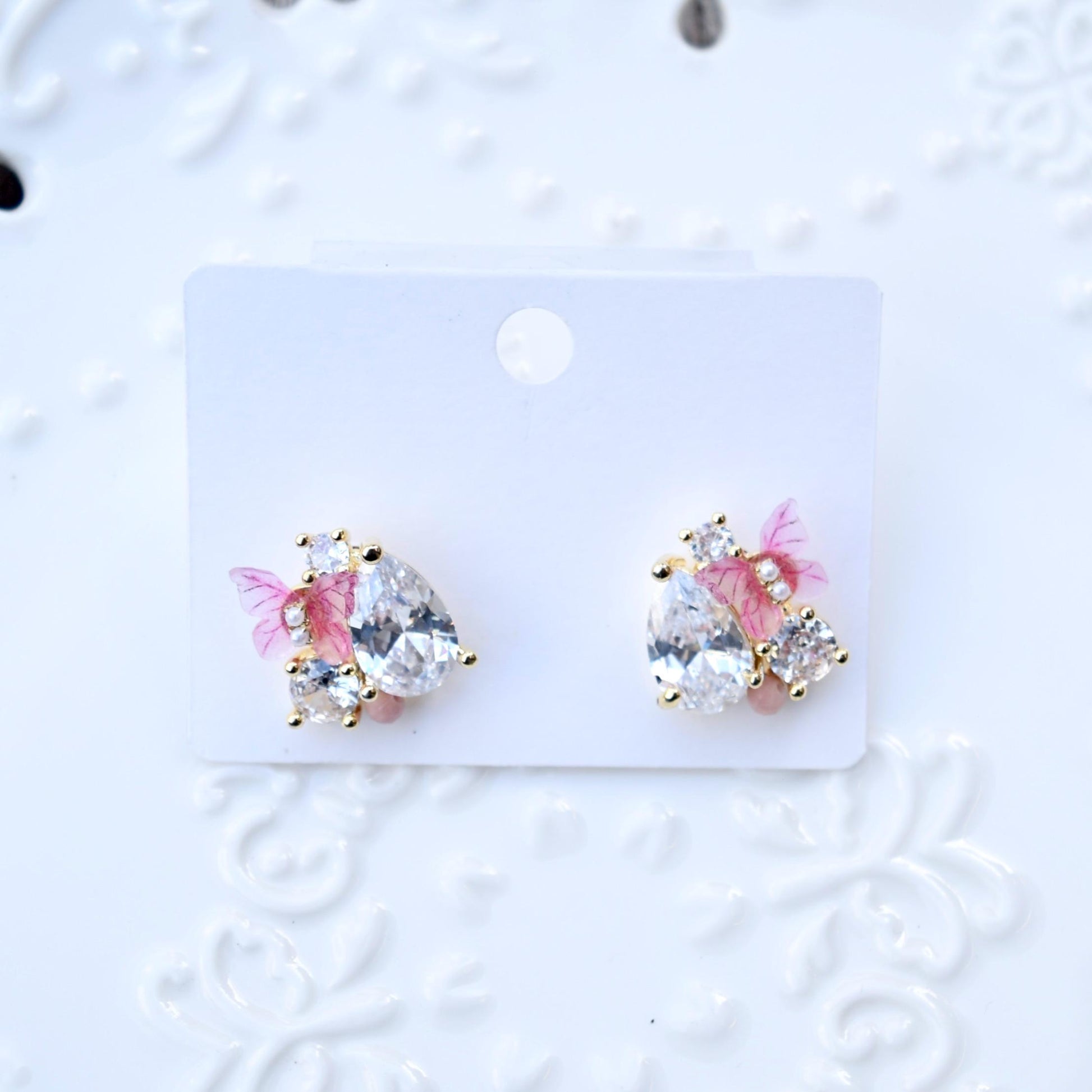 Pink Butterfly Crystal Teardrop Stud Earrings