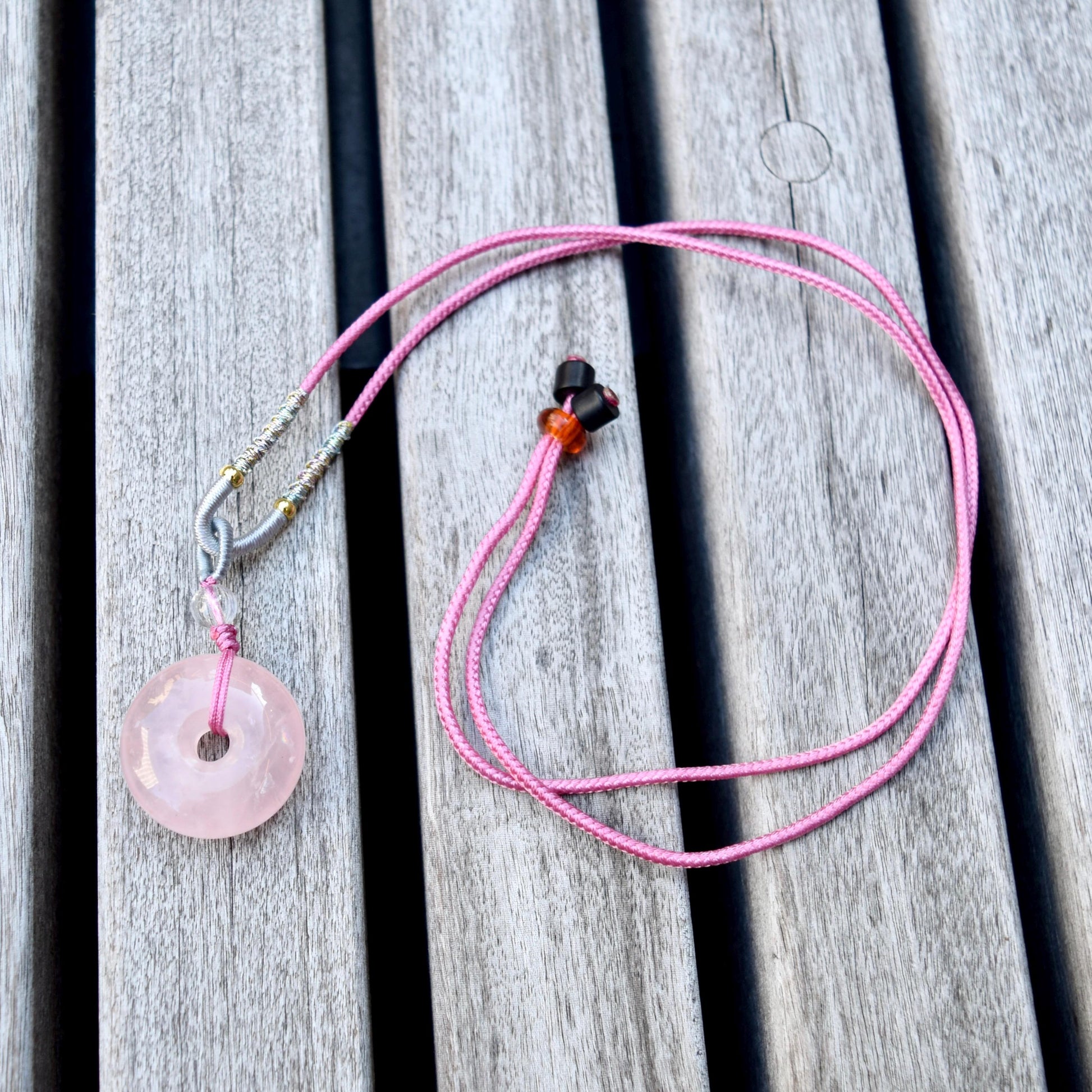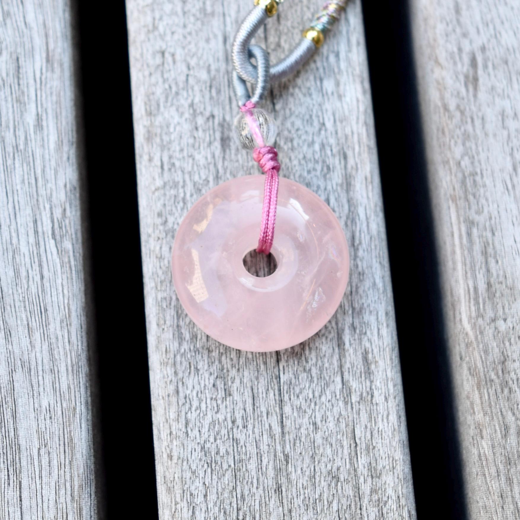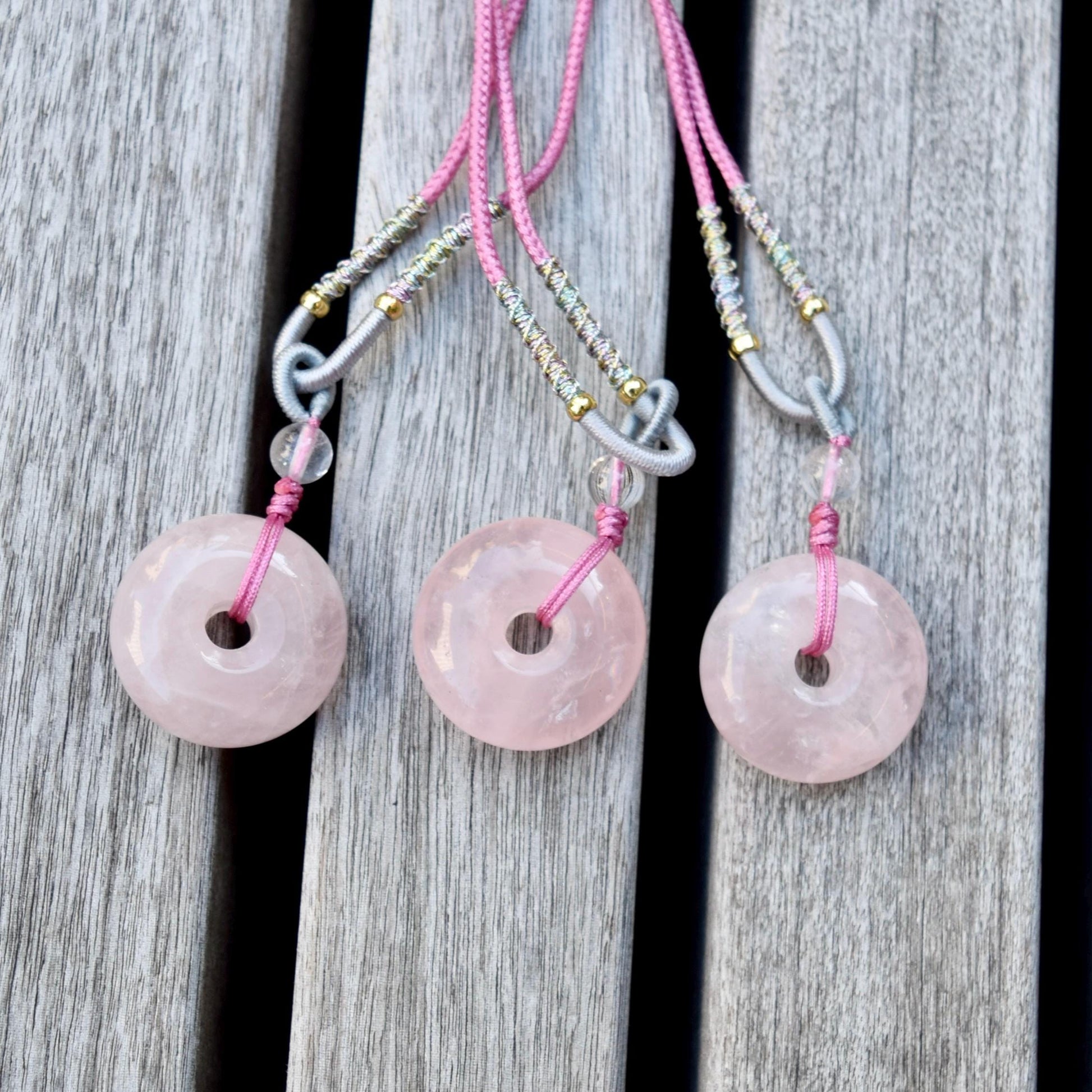 This collection of featured pendants carved as peace buckle ( donut ) pendant, made of natural rose quartz. They will bring you elegant glow and feminine beauty.
