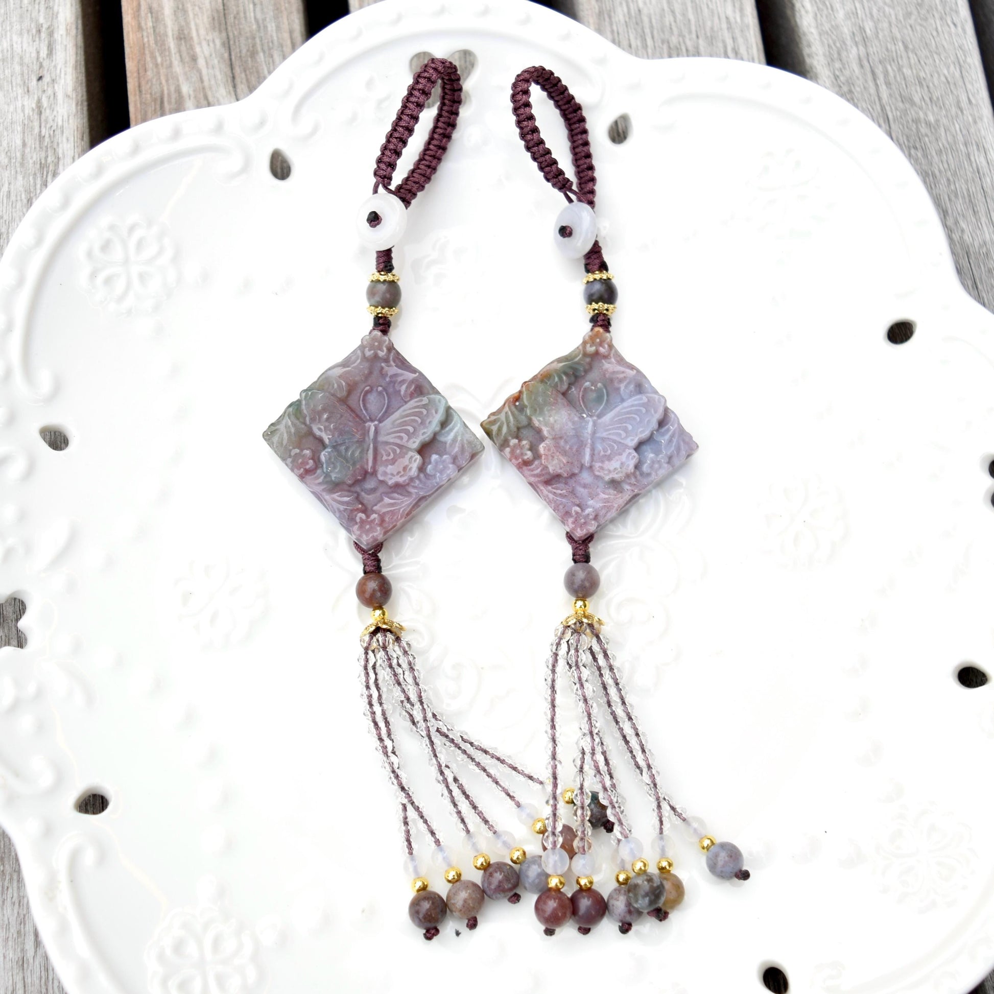 This tassel keychain features jasper pendant carved as butterfly.