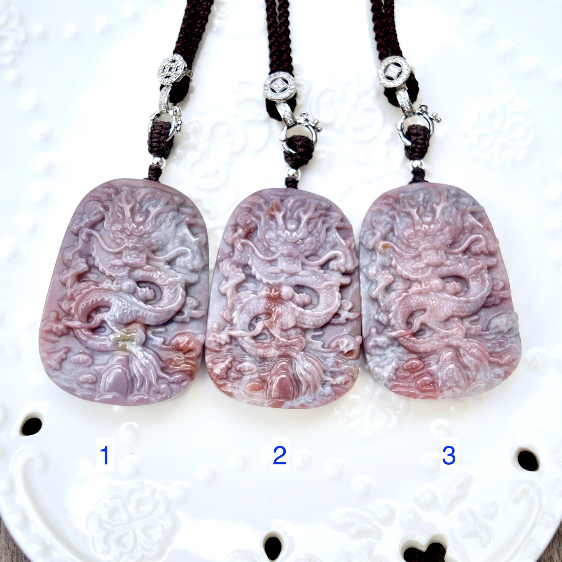 This collection of necklace features ocean jasper pendants carved as Chinese dragon.