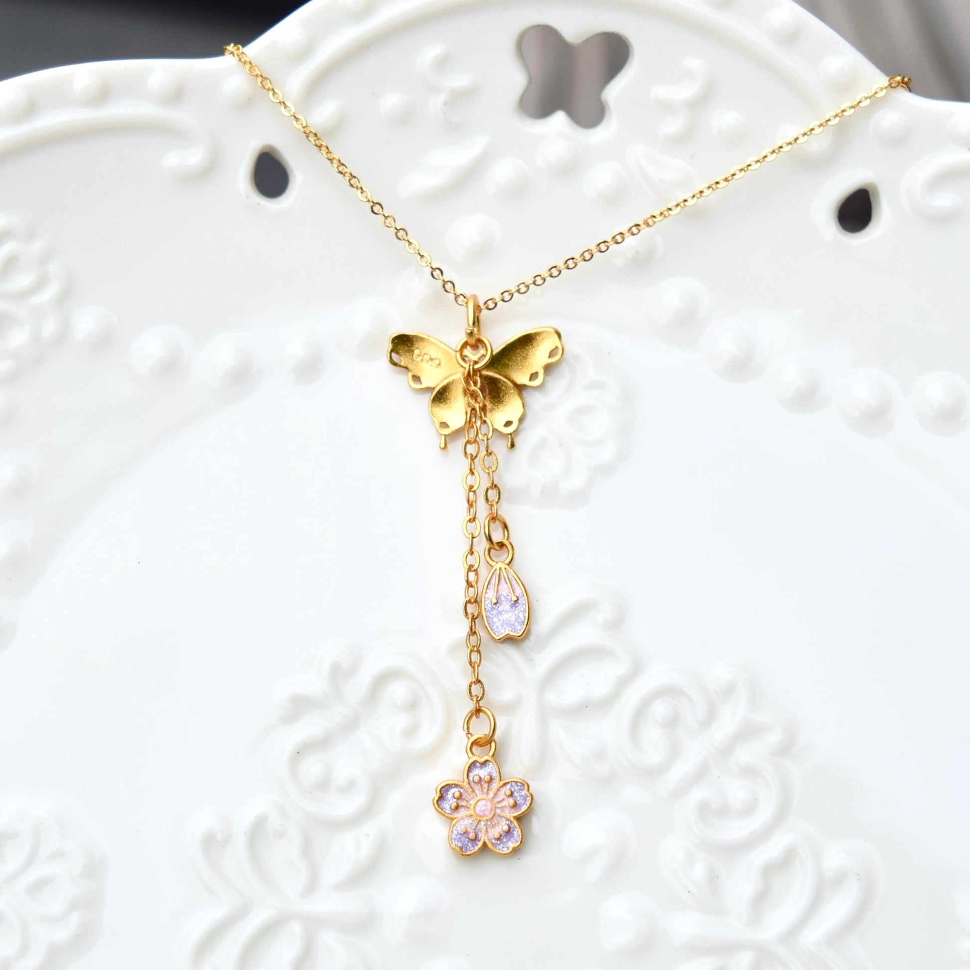 Purple Enamel Butterfly Sakura Charms Necklace - Vintage Style