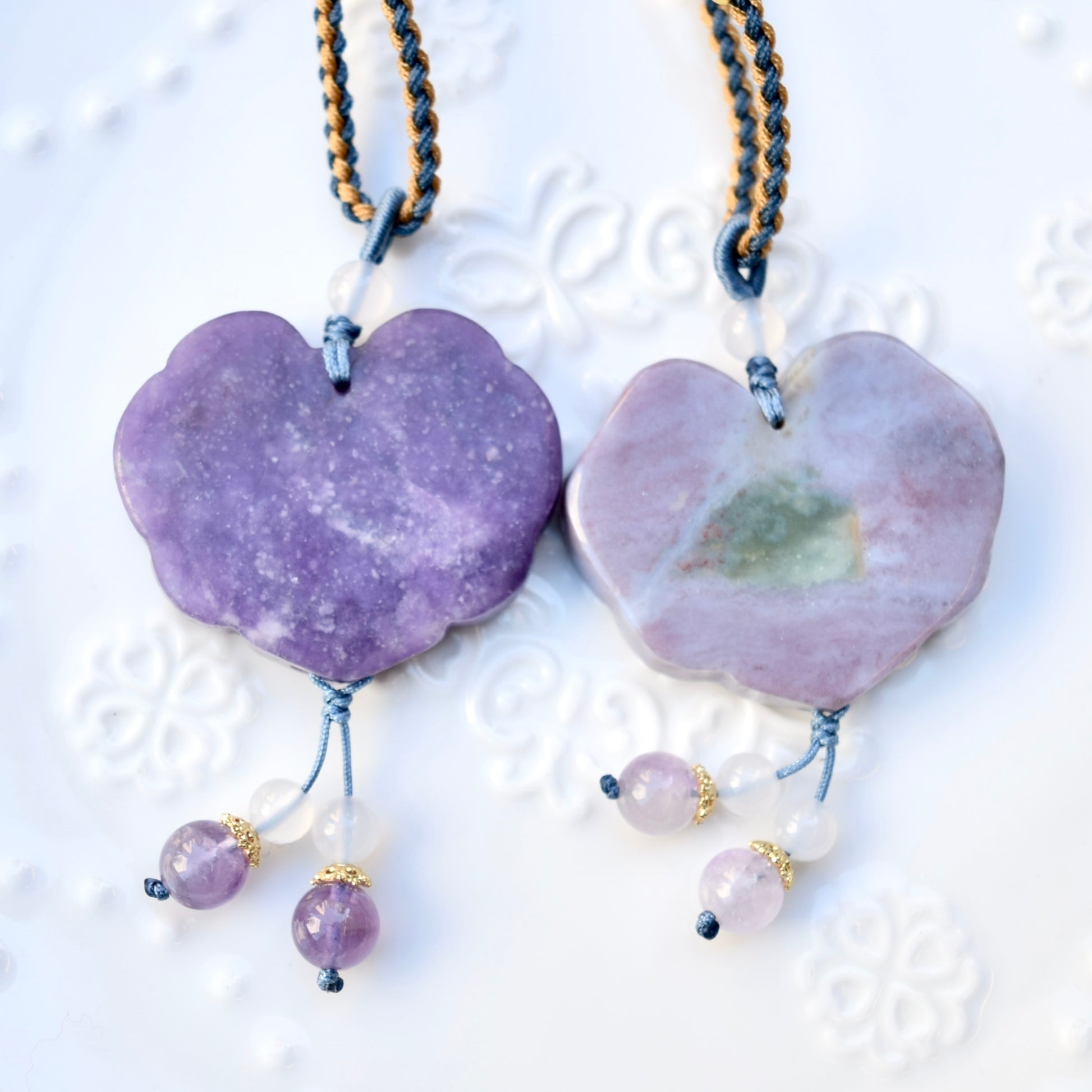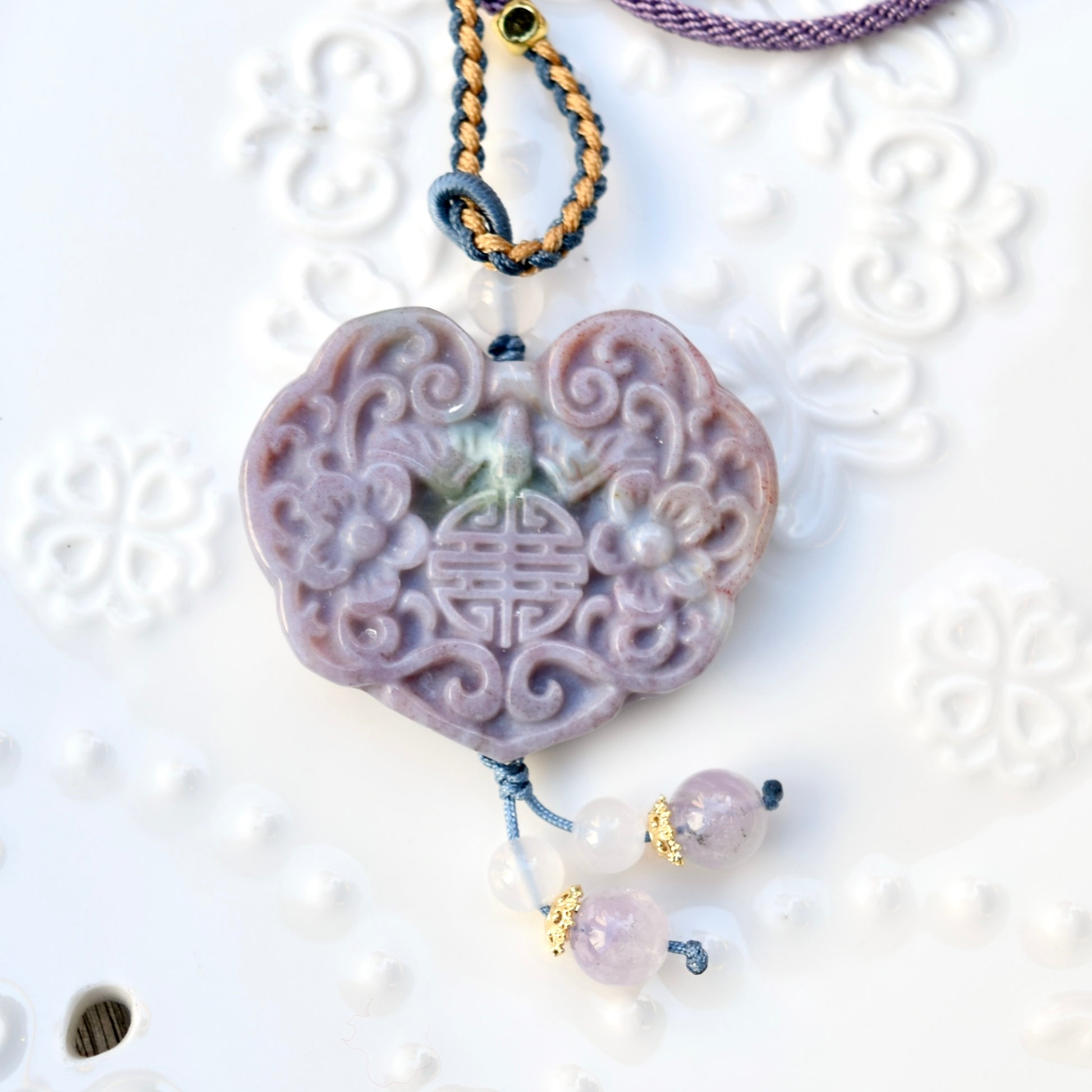 The paired necklace is adjustable with purple cords. The overall design represents traditional Chinese style and conveys wishes for good luck and blessings.