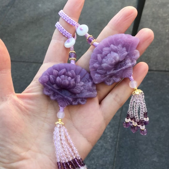 Purple Peony Fan Tassel Keychain Bag Charm - Lepidolite
