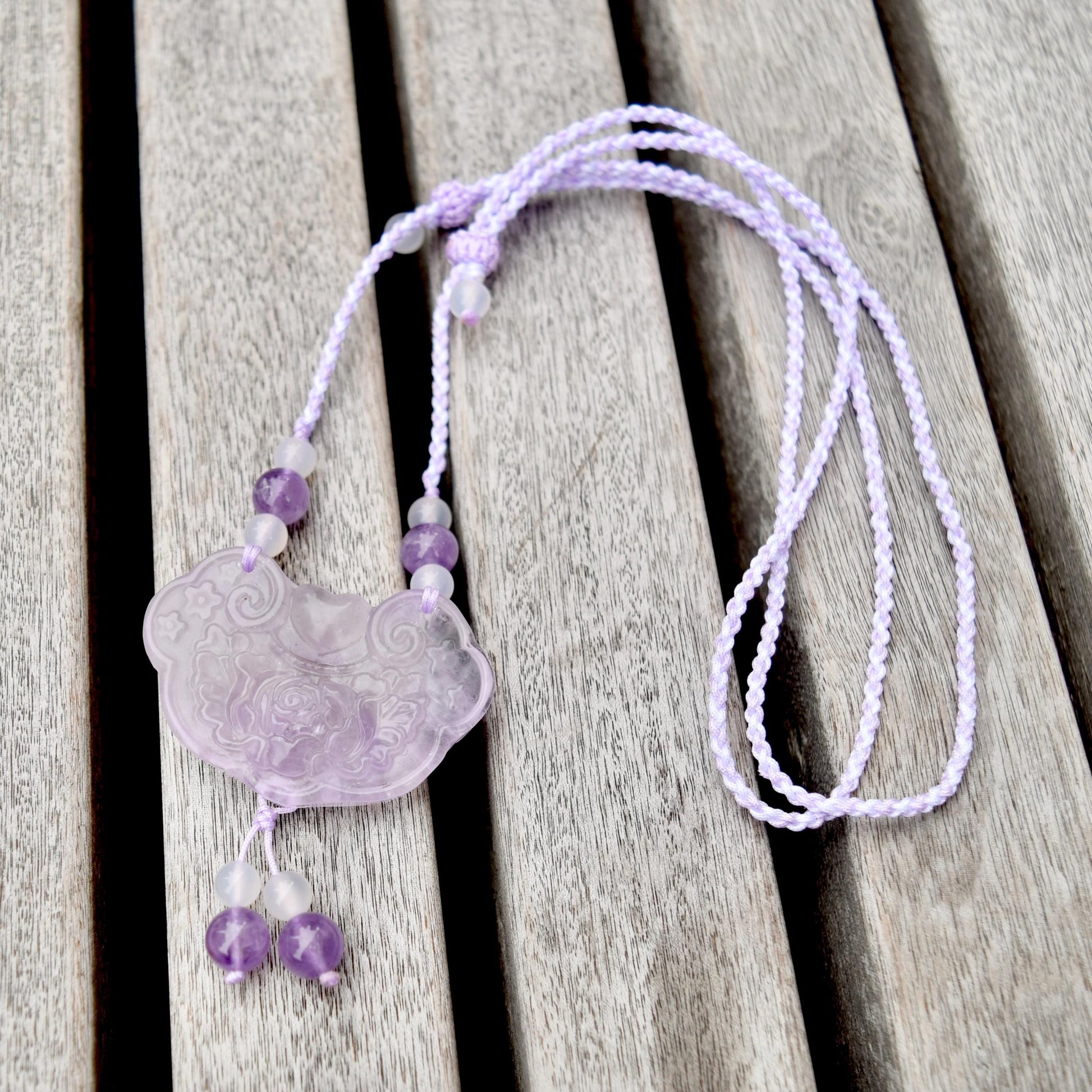 Purple Peony Lock Pendant Rope Necklace - Amethyst Crystal Pendant
