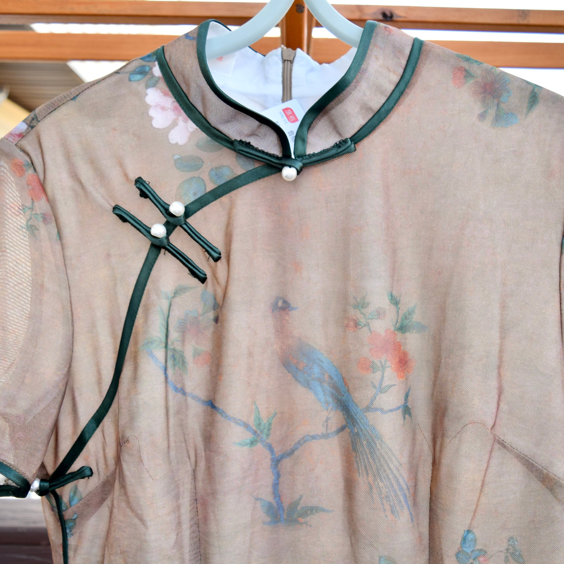 Brown Mesh Flower Bird Qipao Long Dress - Chinese Traditional Cheongsam