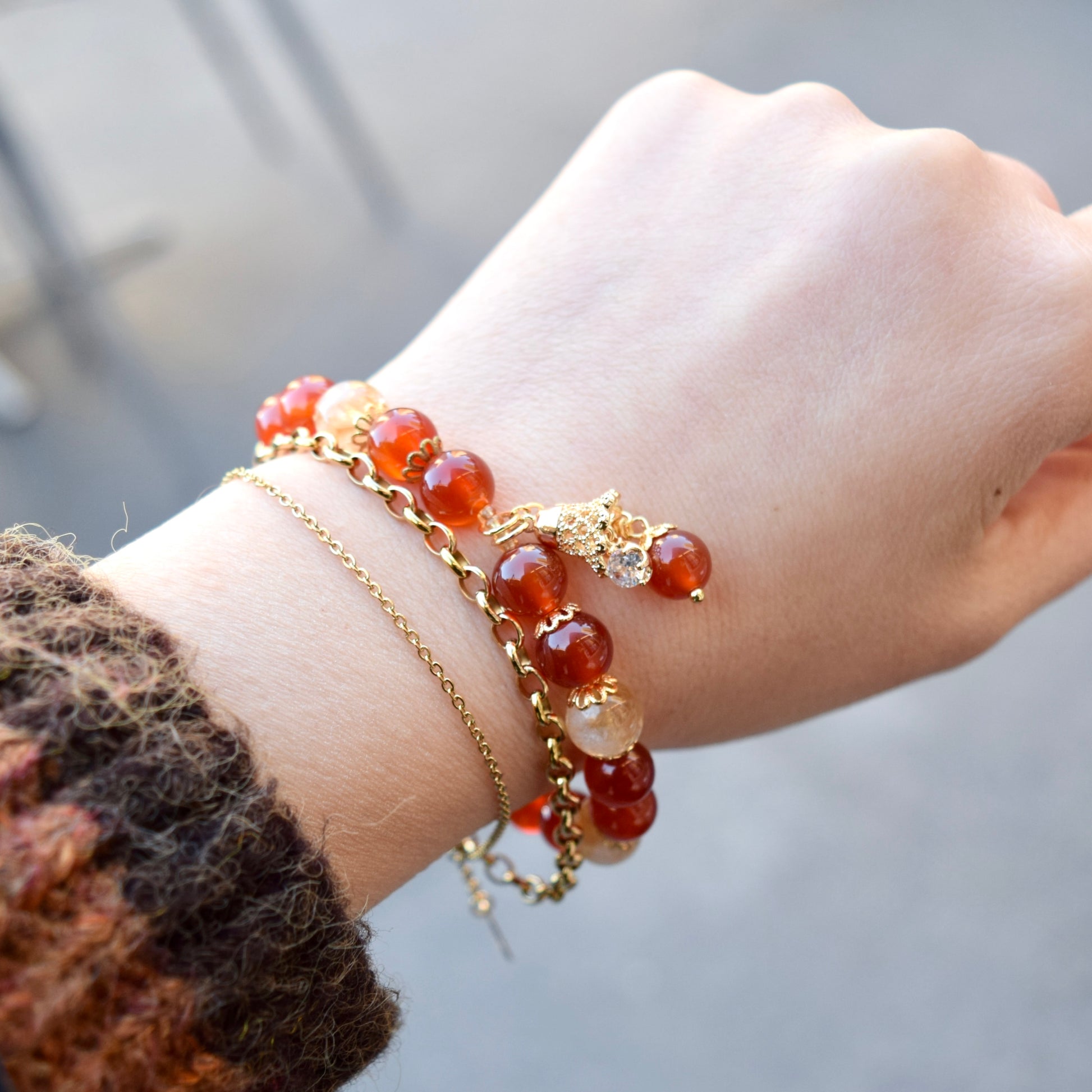 This bracelet is delicately crafted with selected red agate and citrine beads, accented by a golden bell charm. It creates a warm, traditional fortune-inspired atmosphere, making it a perfect gift for her.