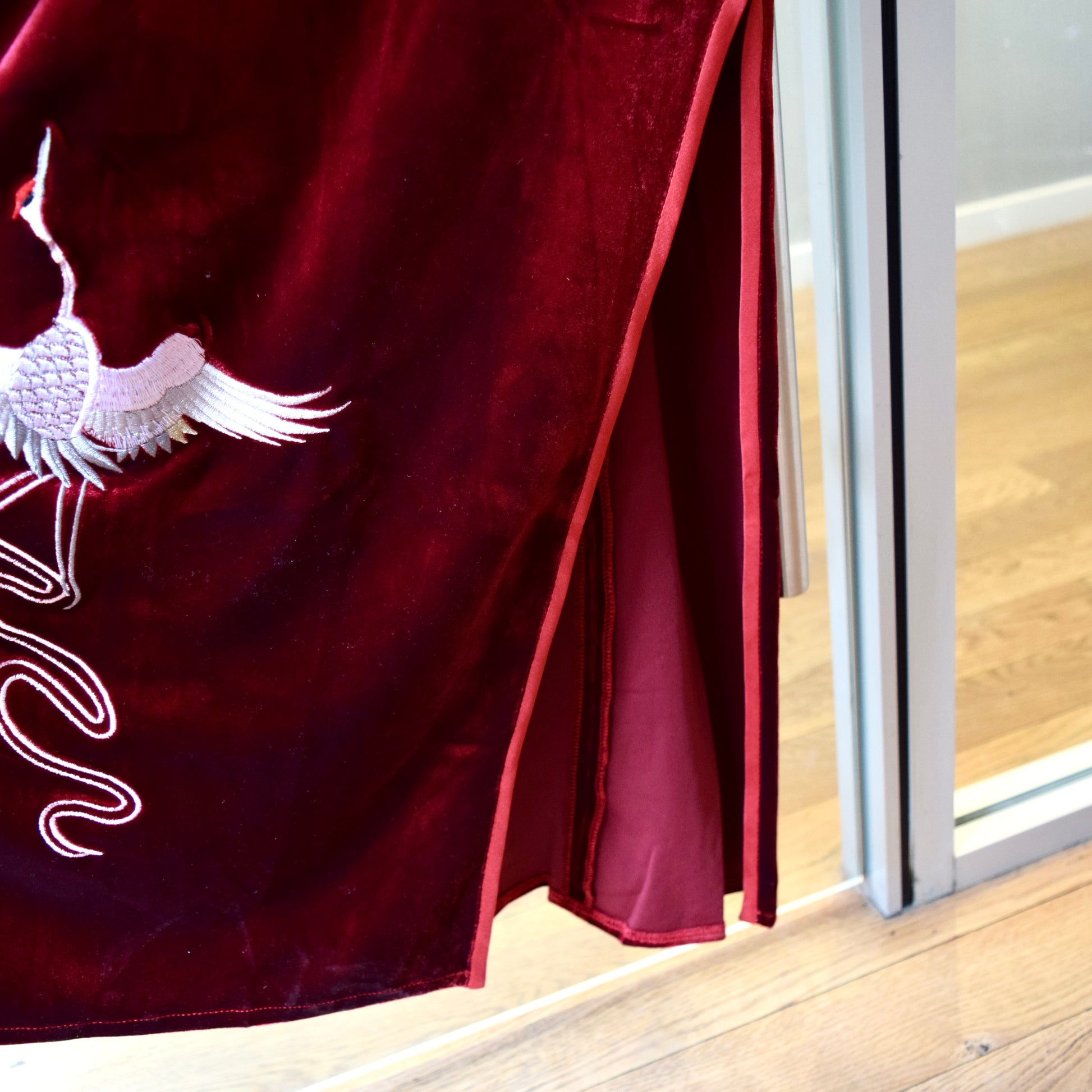 Red Velvet Crane Embroidered Qipao Midi Dress - Chinese Cheongsam
