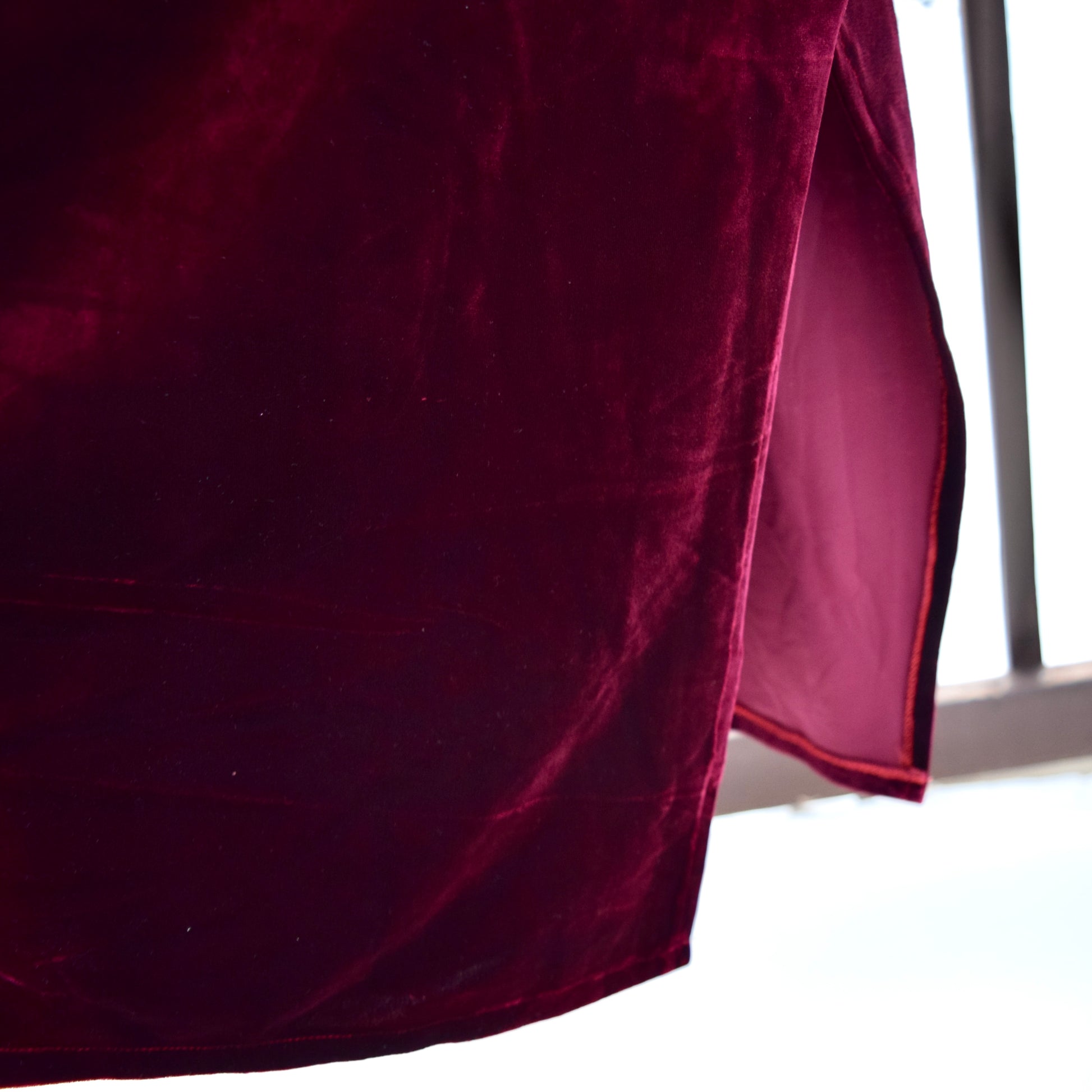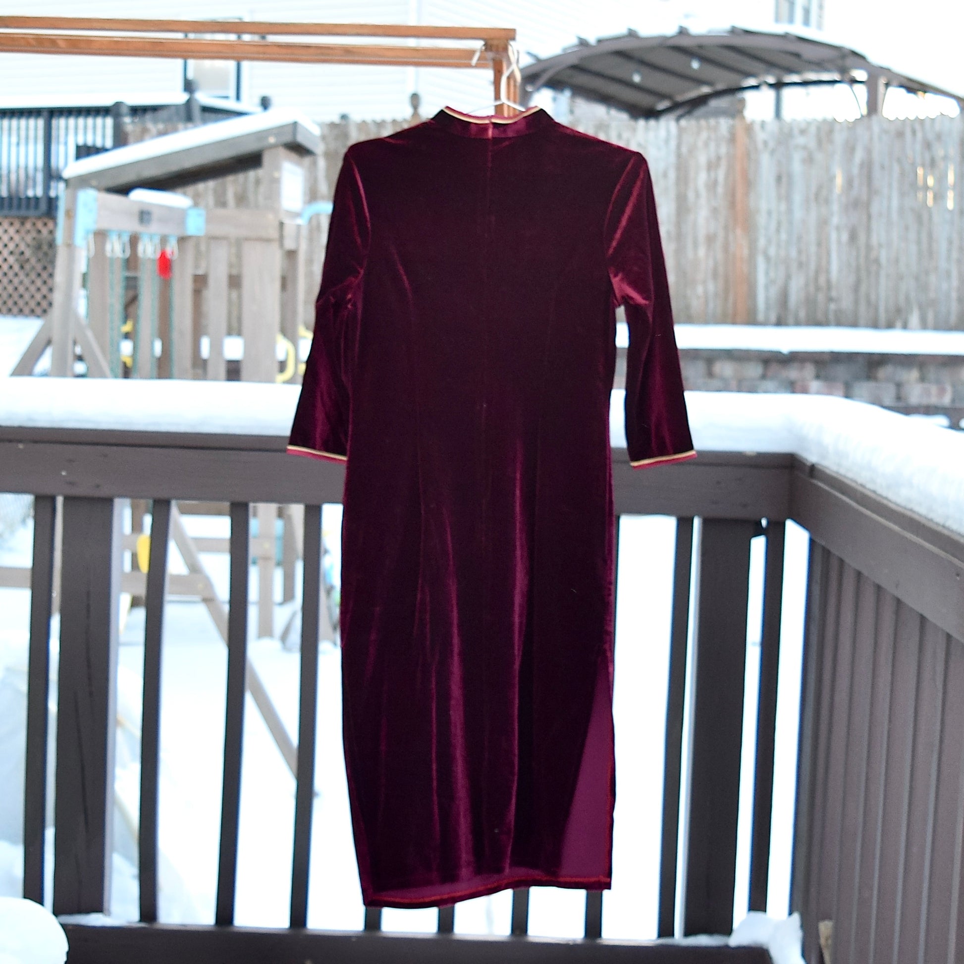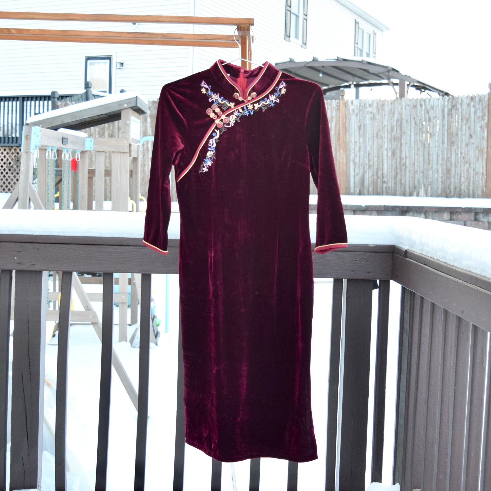 Red Velvet Flower Embroidered Qipao Midi Dress - Chinese Cheongsam
