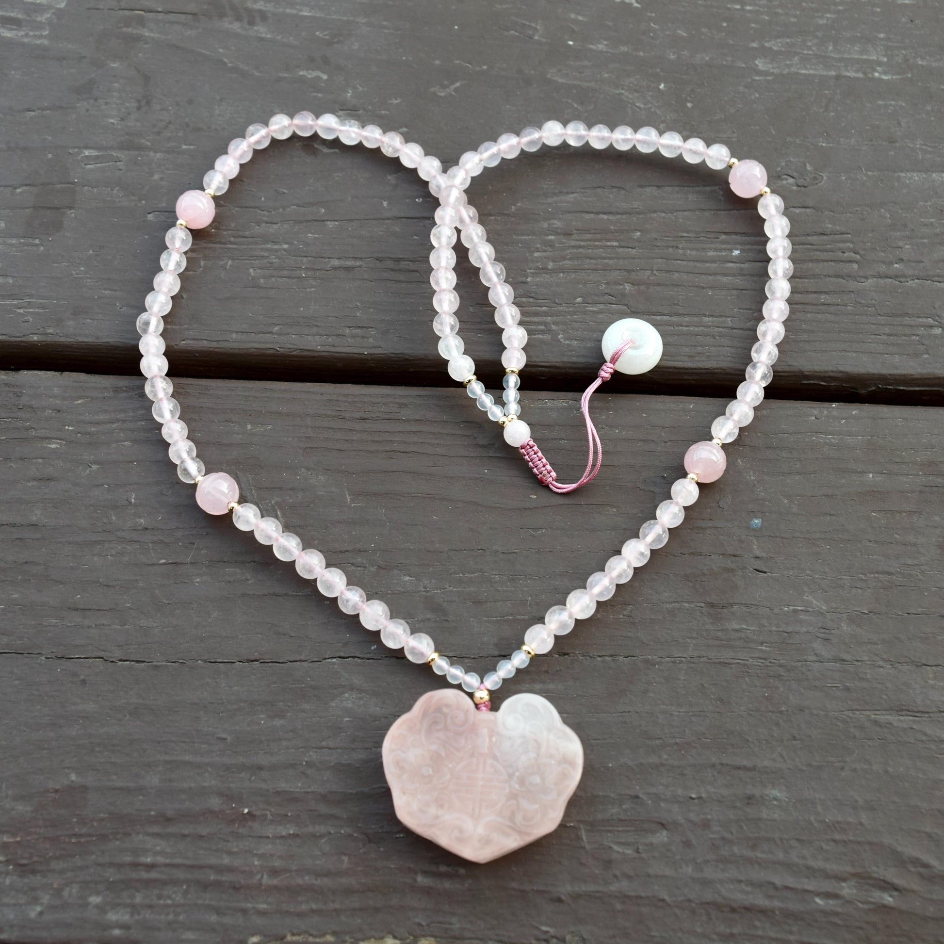 This delicate braided necklace features rose quartz pendant carved as Chinese flora lock. The paired beaded chain is made of rose quartz and lotus quartz jade beads. Its soft pink tone creates a sweet and fresh style and is perfect for someone with a girly heart!