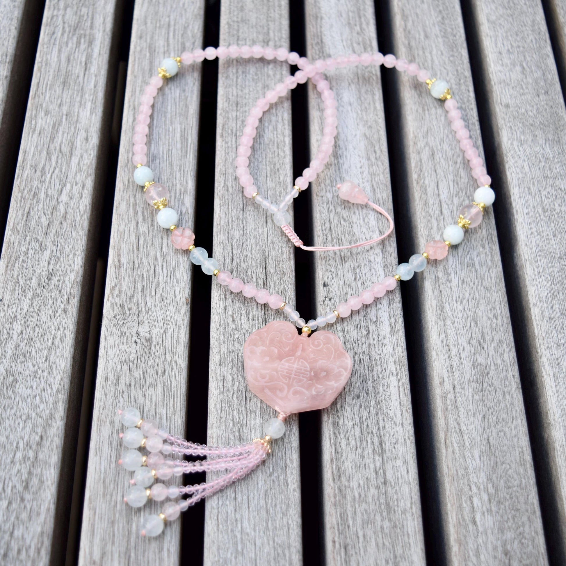 Rose Quartz Flora Ruyi Lock Necklace - Aquamarine Quartz Beaded