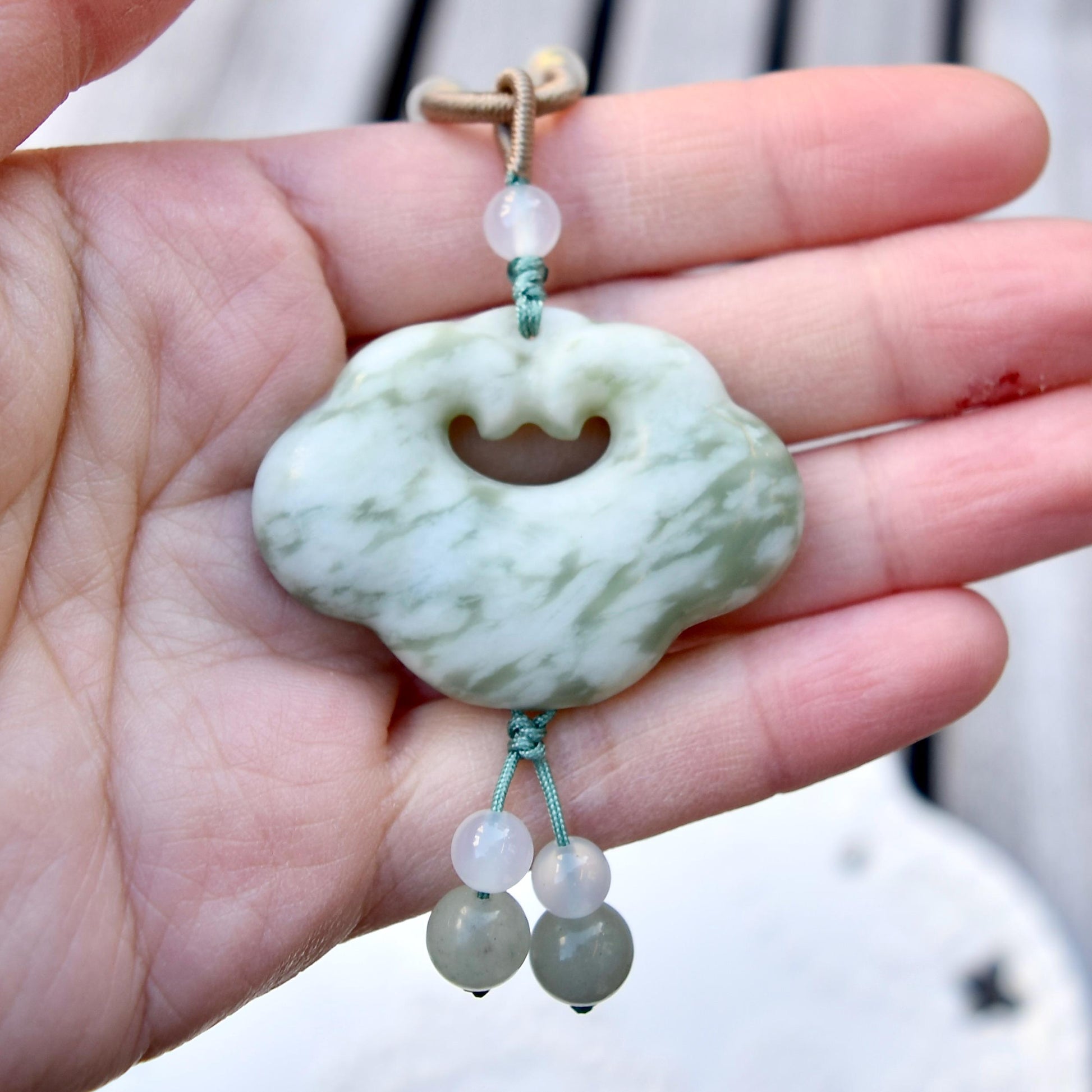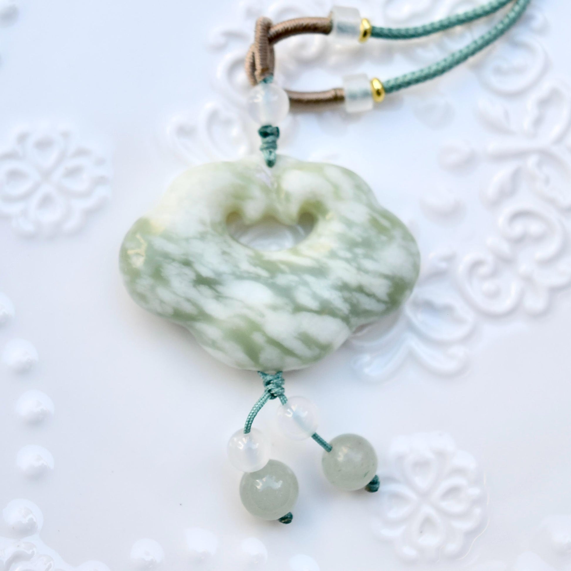 This piece of jade necklace select high-quality Xiu jade pendant (serpentine jade). It is carved as a Ruyi lock, with an auspicious meaning: “according to one’s wishes” or “being felt satisfied and happy”. These jade pendant also has unique could-like patterns with green-white tone.