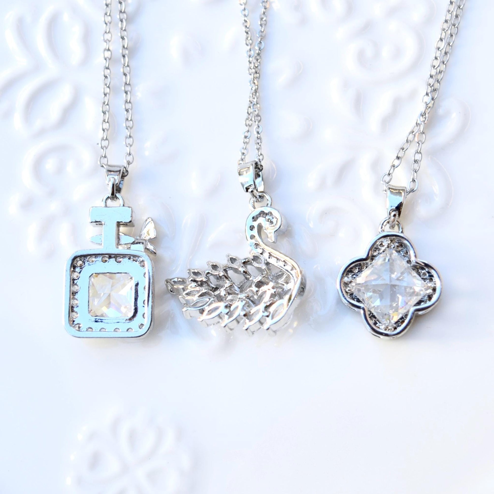 This cute necklace collection features crystals charms: perfume bottle, swan and clover, made of CZ diamonds. The paired chain is made of stainless steel with wonderful color retention. It's perfect matching other silver necklaces as layered jewelry and you can wear this necklace daily or on special occasions! Also making a wonderful gifts for her on holiday!