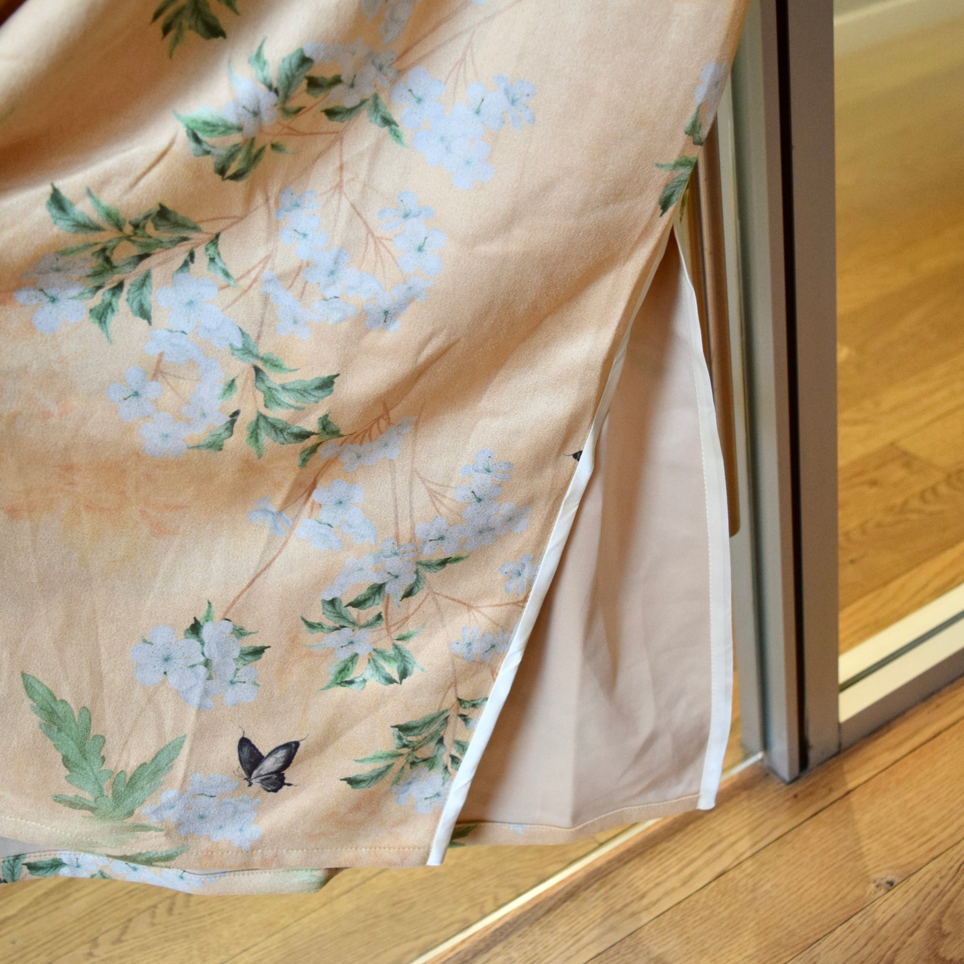 Yellow Flora Butterfly Qipao Midi Dress - Faux Suedue Chinese Cheongsam